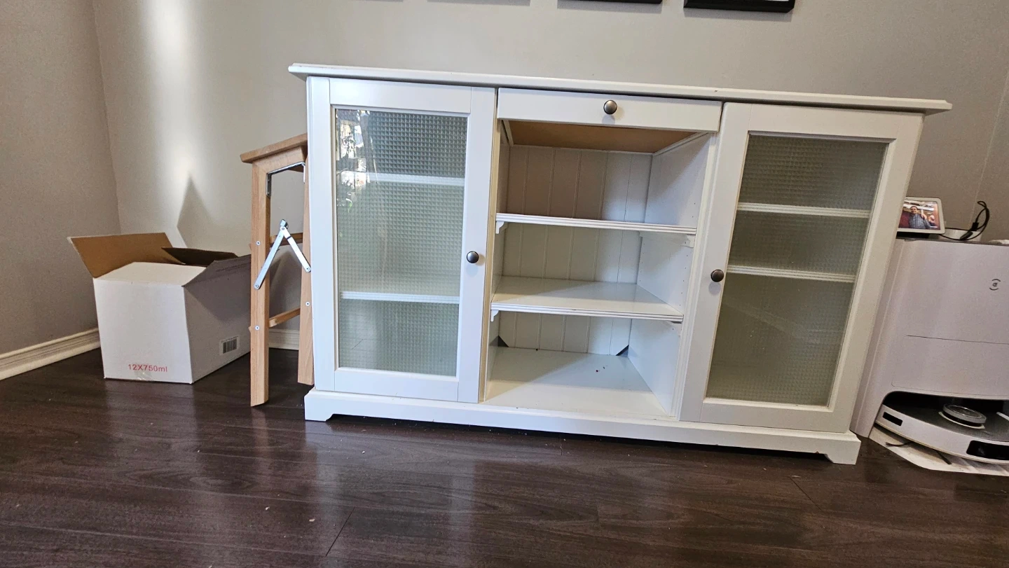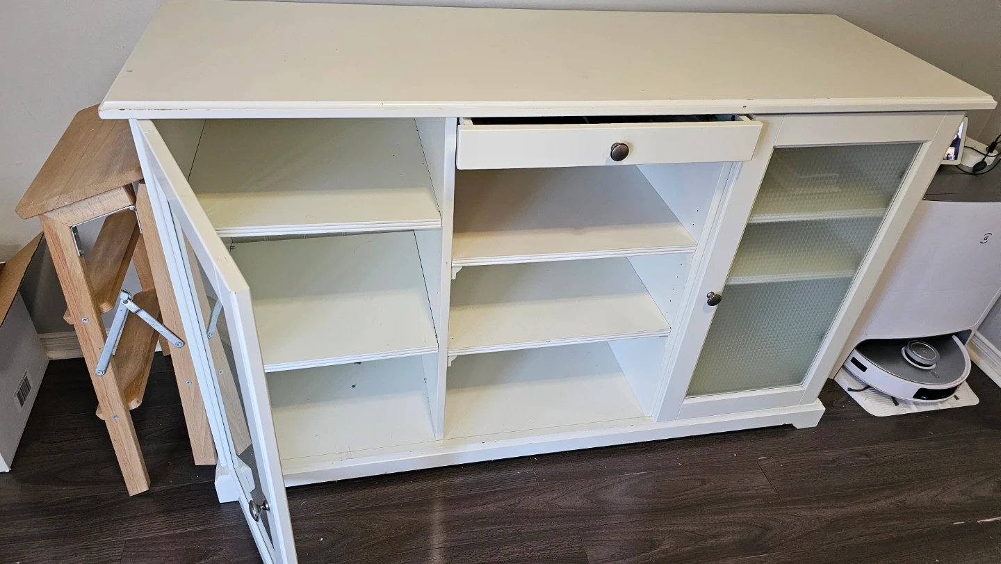 This white media console cabinet features two glass-front doors and an open shelving section with a single drawer. It offers ample storage with adjustable shelves inside the cabinets. It's perfect for organizing electronics or displaying decor.
