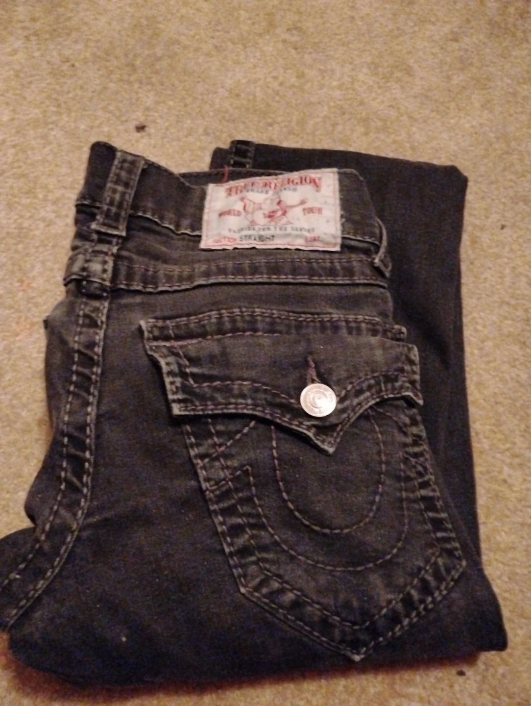 These are True Religion men's black straight leg jeans. They're made from denim.
