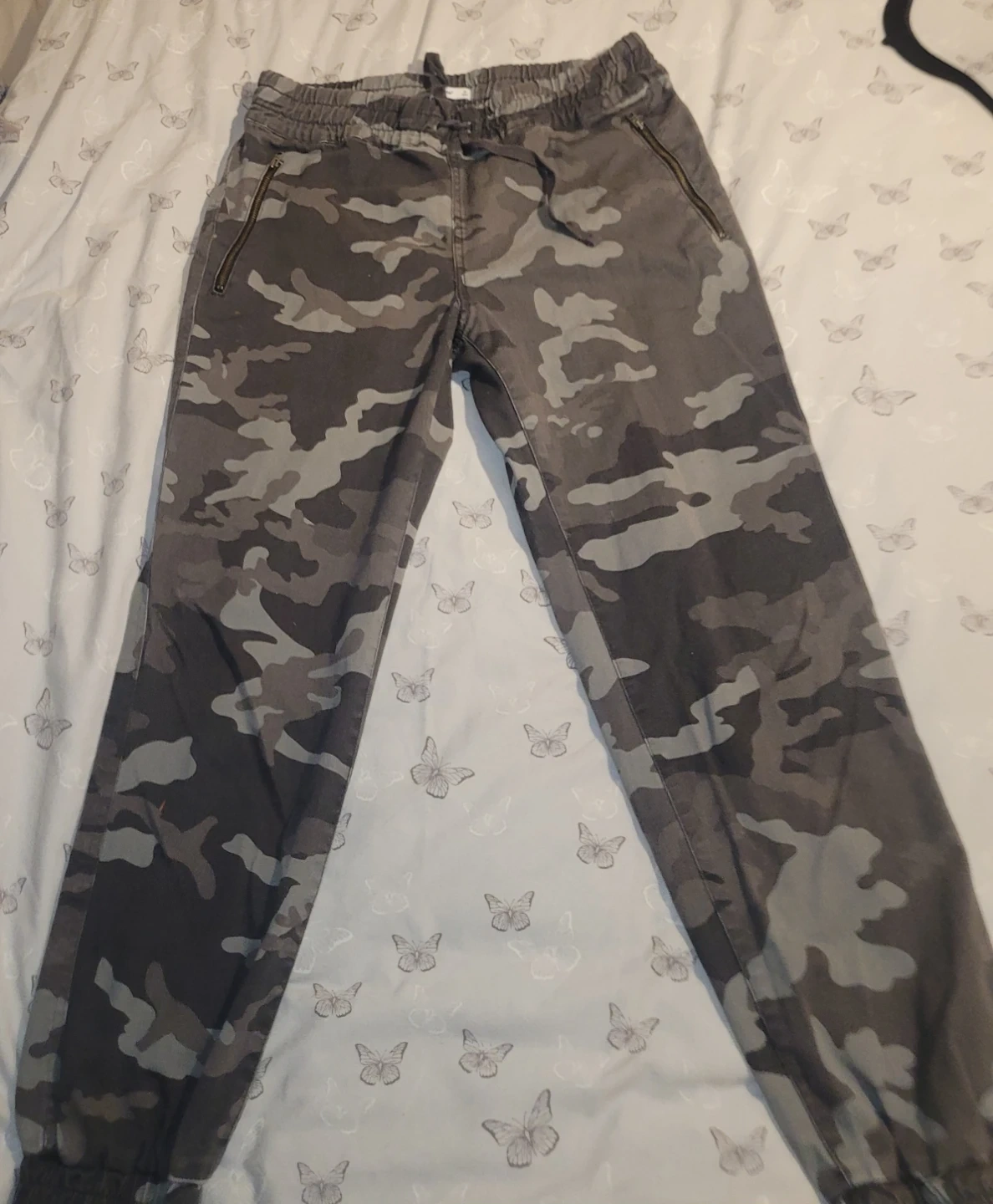 These Tna cargo jogger pants feature a cool camouflage print. They have an elastic waistband with a drawstring and zippered pockets. Elastic cuffs keep them snug.