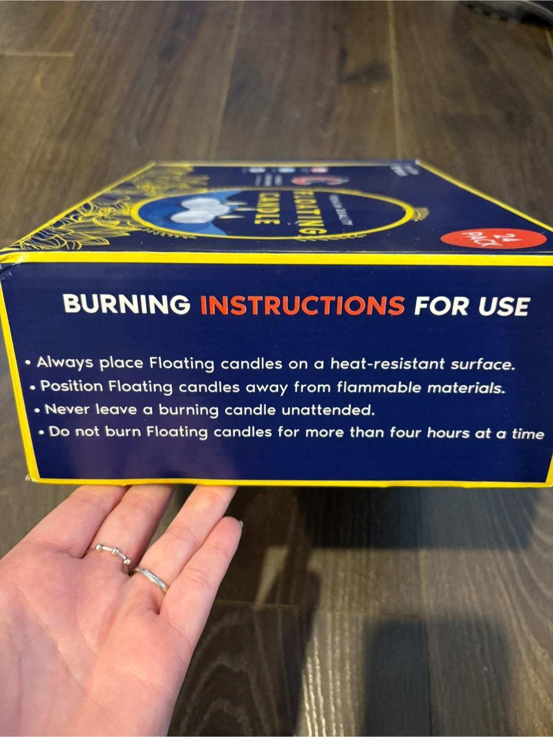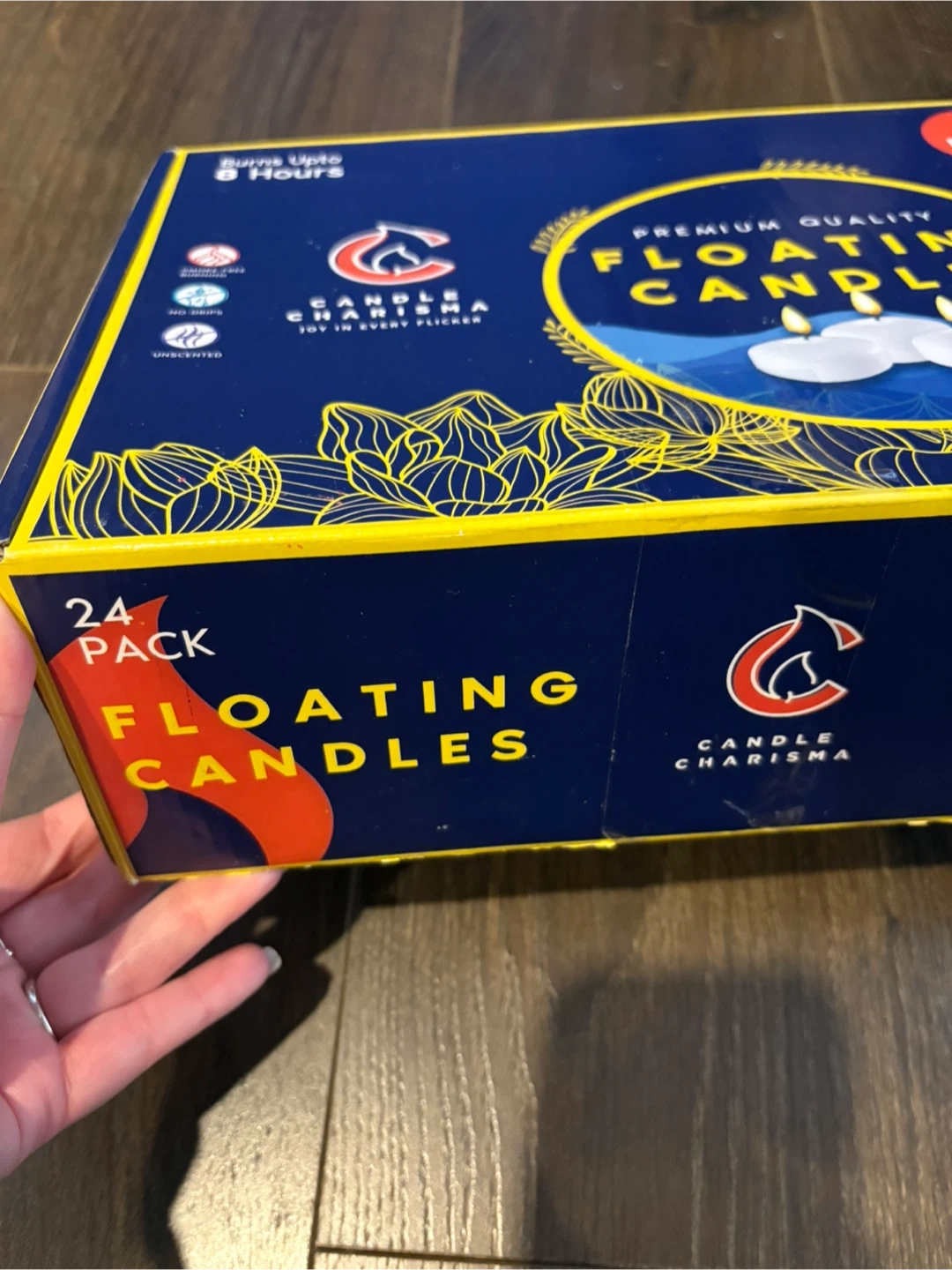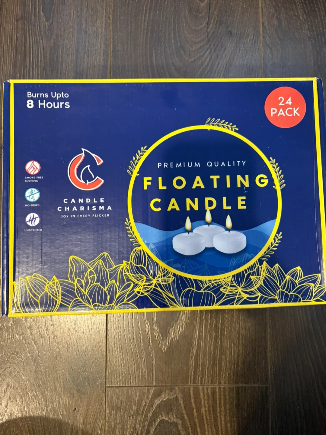 24-pack of Candle Charisma floating candles. They are unscented and smoke-free. Burns up to 8 hours per candle.
