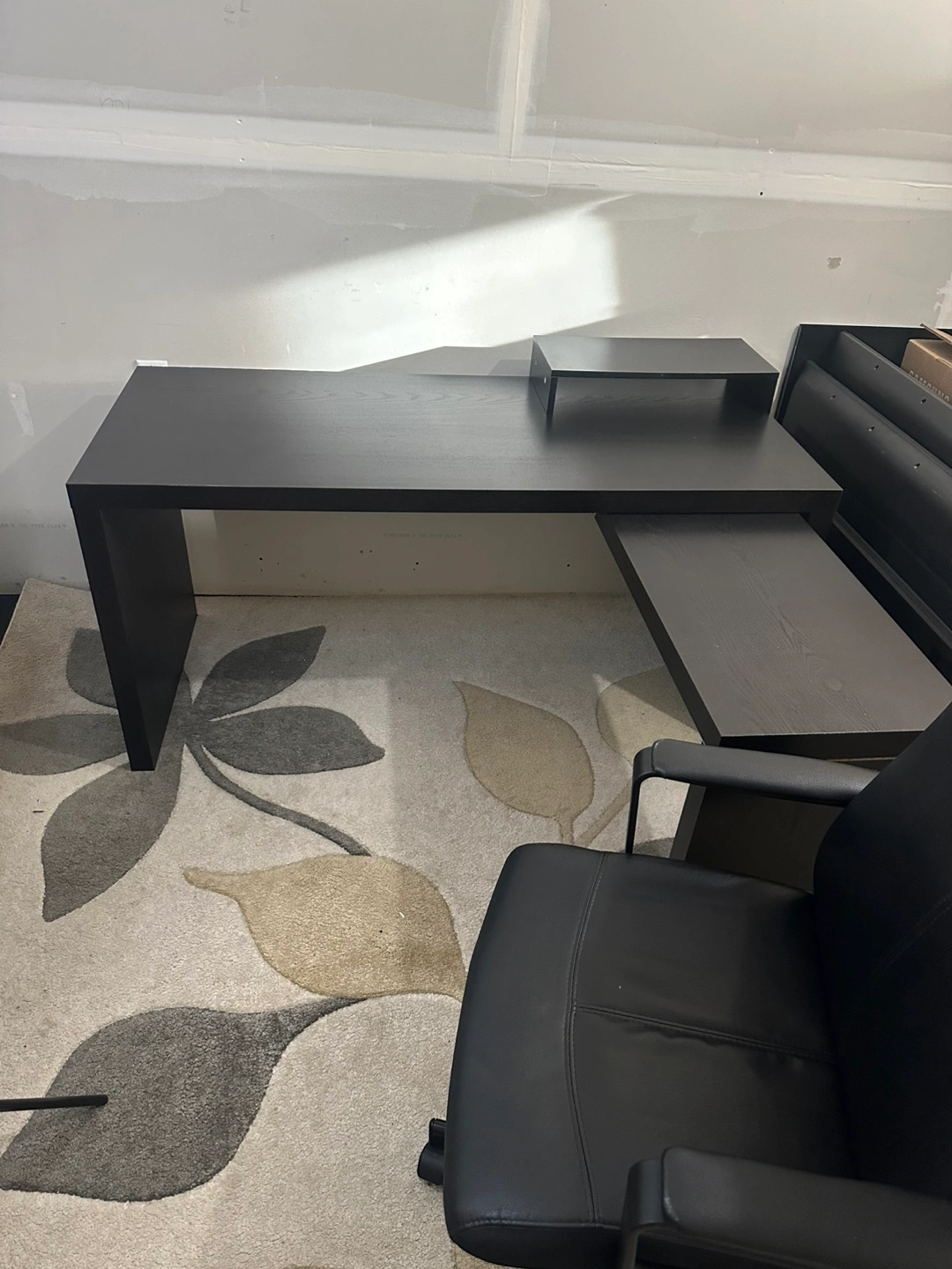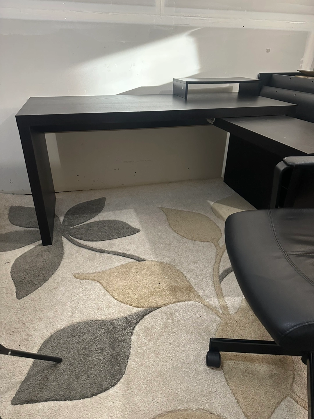 IKEA L-Shaped computer desk & chair - dark brown, extendable.