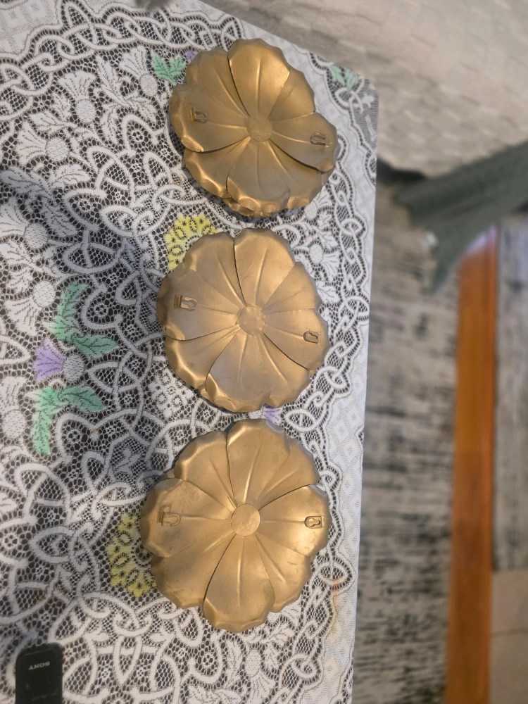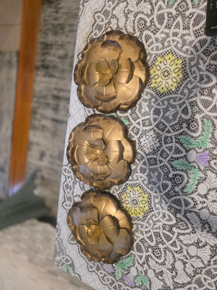 Selling a set of three metal flower wall decorations! These have a lovely golden colour and would look great in any room. They're in good condition and ready to brighten up your space