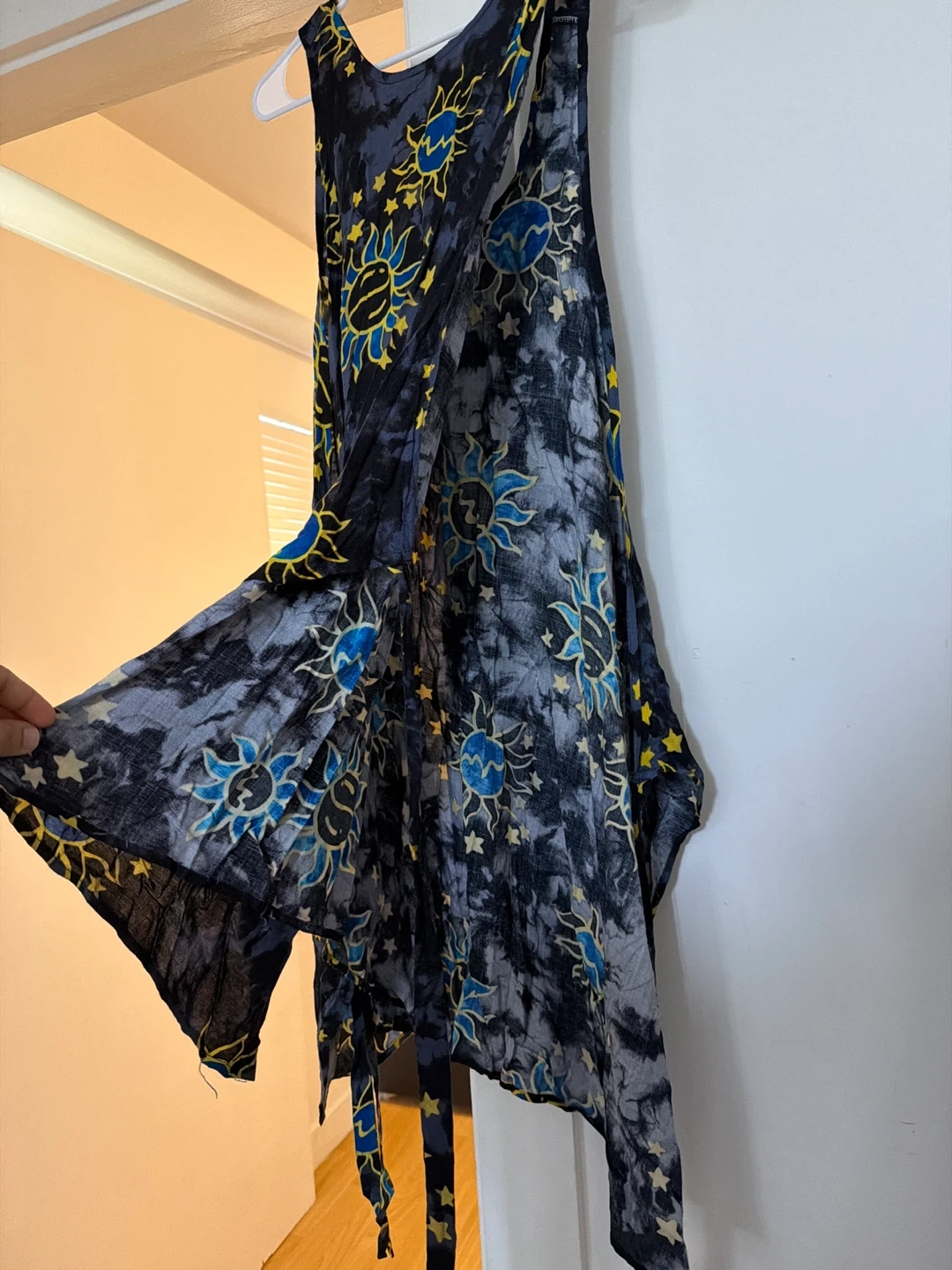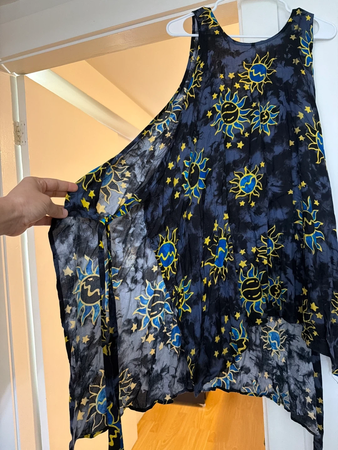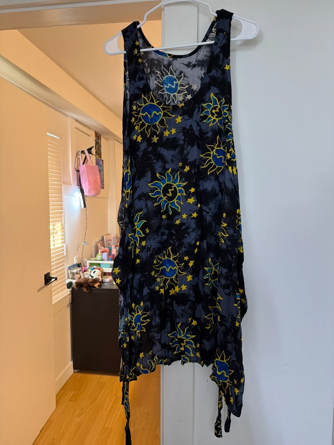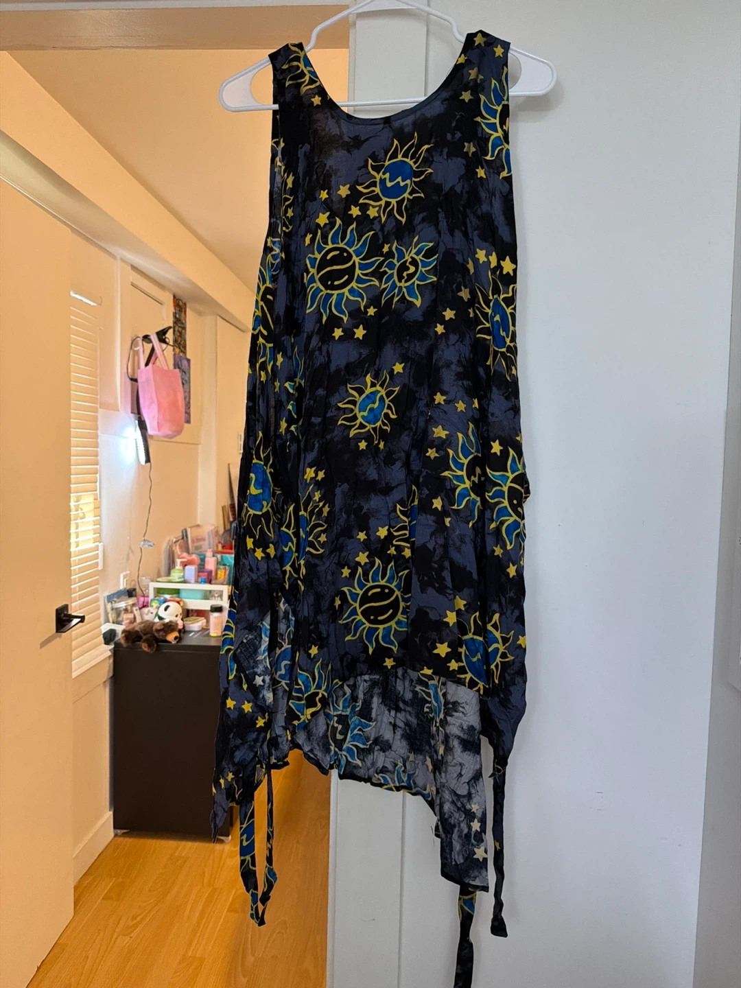 This sleeveless dress features a vibrant sun and stars print on a tie-dye background. It has a flowy, asymmetrical hemline and is made of lightweight fabric. Easy to layer for a casual or beachy look!