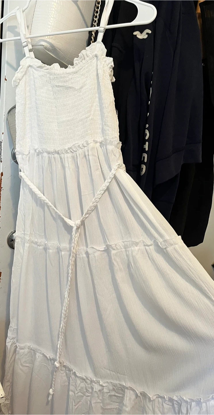 This white maxi dress by Jolie & Joy features a smocked bodice and tiered skirt. It's made from a lightweight fabric and includes a braided rope belt. The adjustable straps and ruffled neckline add a feminine touch.๐