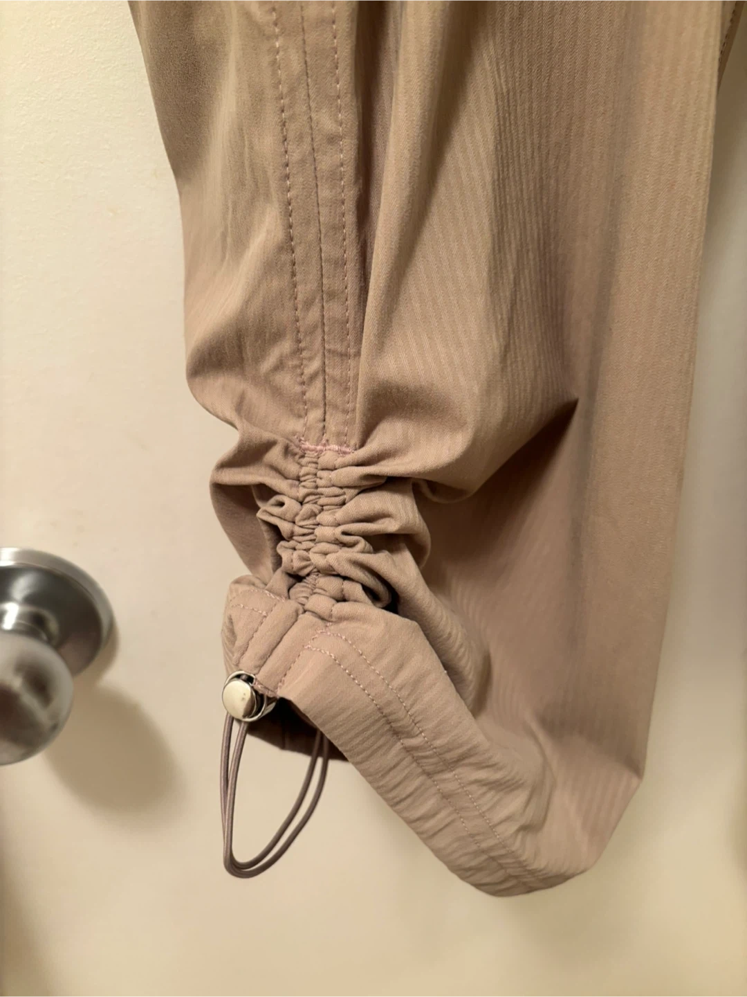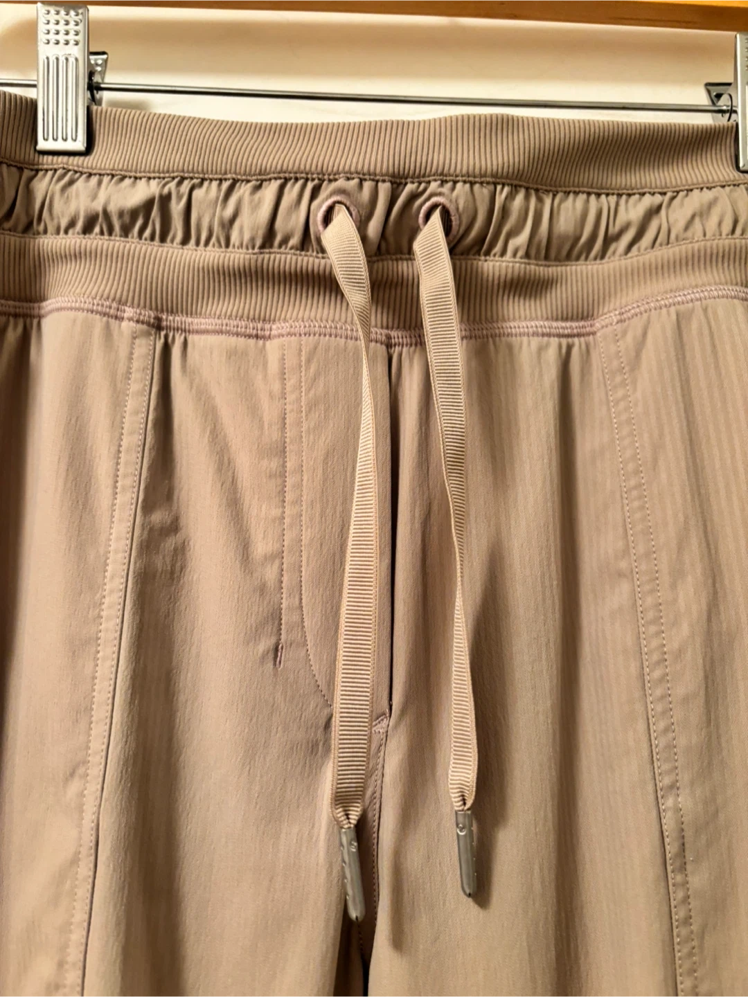 These Lululemon pants are made of a lightweight, textured fabric. They feature a drawstring waist and adjustable cinched cuffs. Great for casual wear or light activity! Original price $88 + tax.