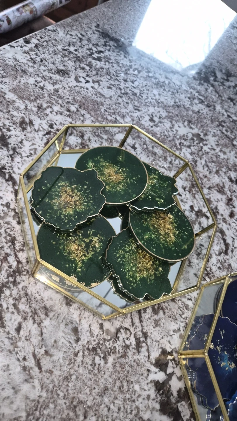 I'm selling a set of handmade resin coasters with lovely gold accents. They come in a beautiful tray, perfect for adding a touch of elegance to your coffee table or bar area. The coasters are a great way to protect your furniture from water rings while adding a decorative touch to your home!