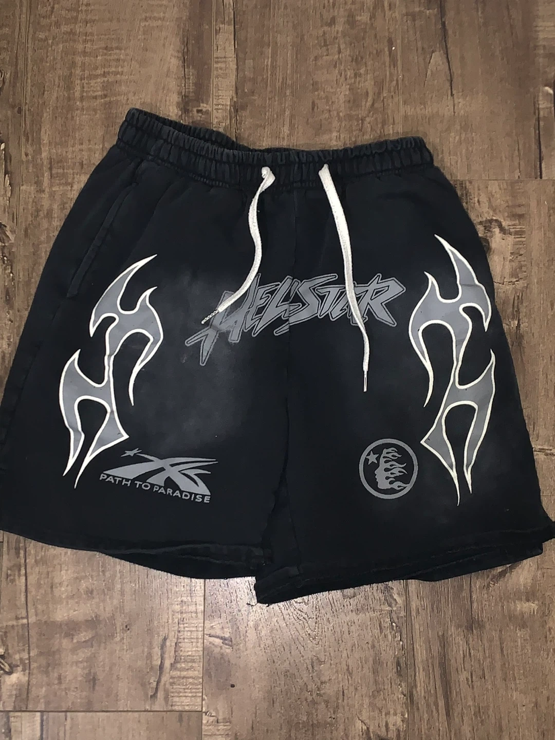 Cool pair of Black Hellstar shorts perfect for the spring / summer! Complete with the signature “path to paradise” tagline and logo. Size medium.
