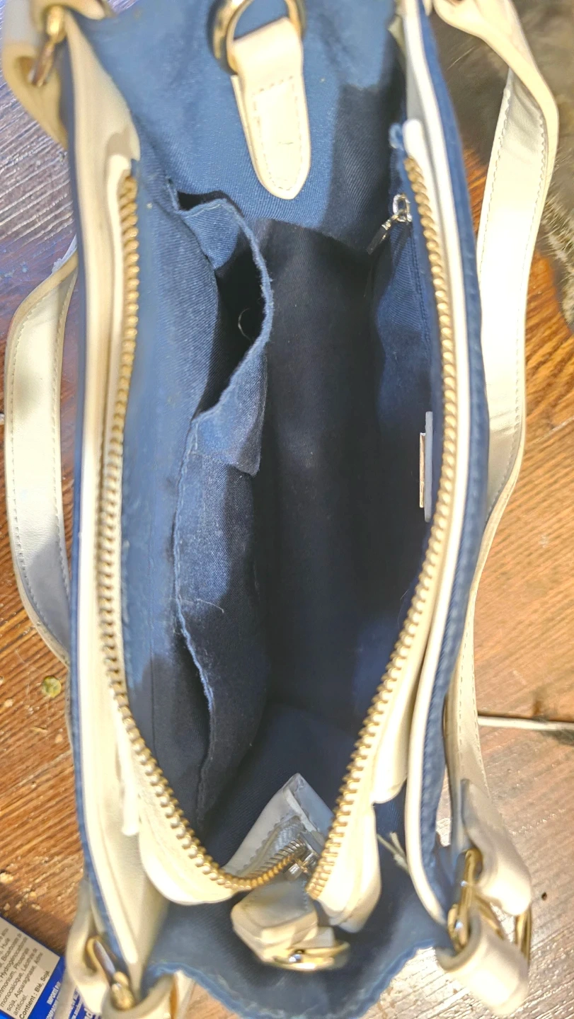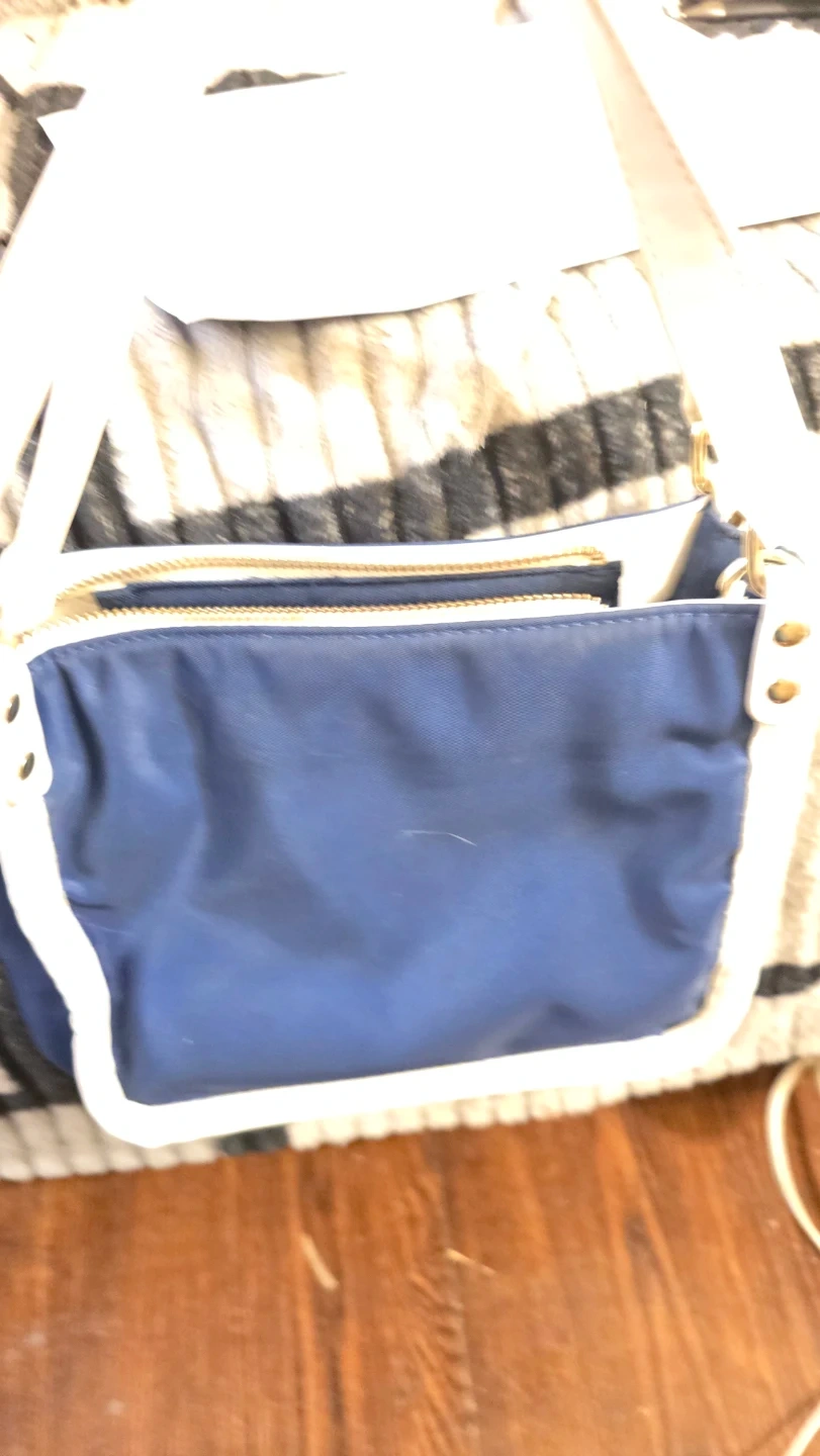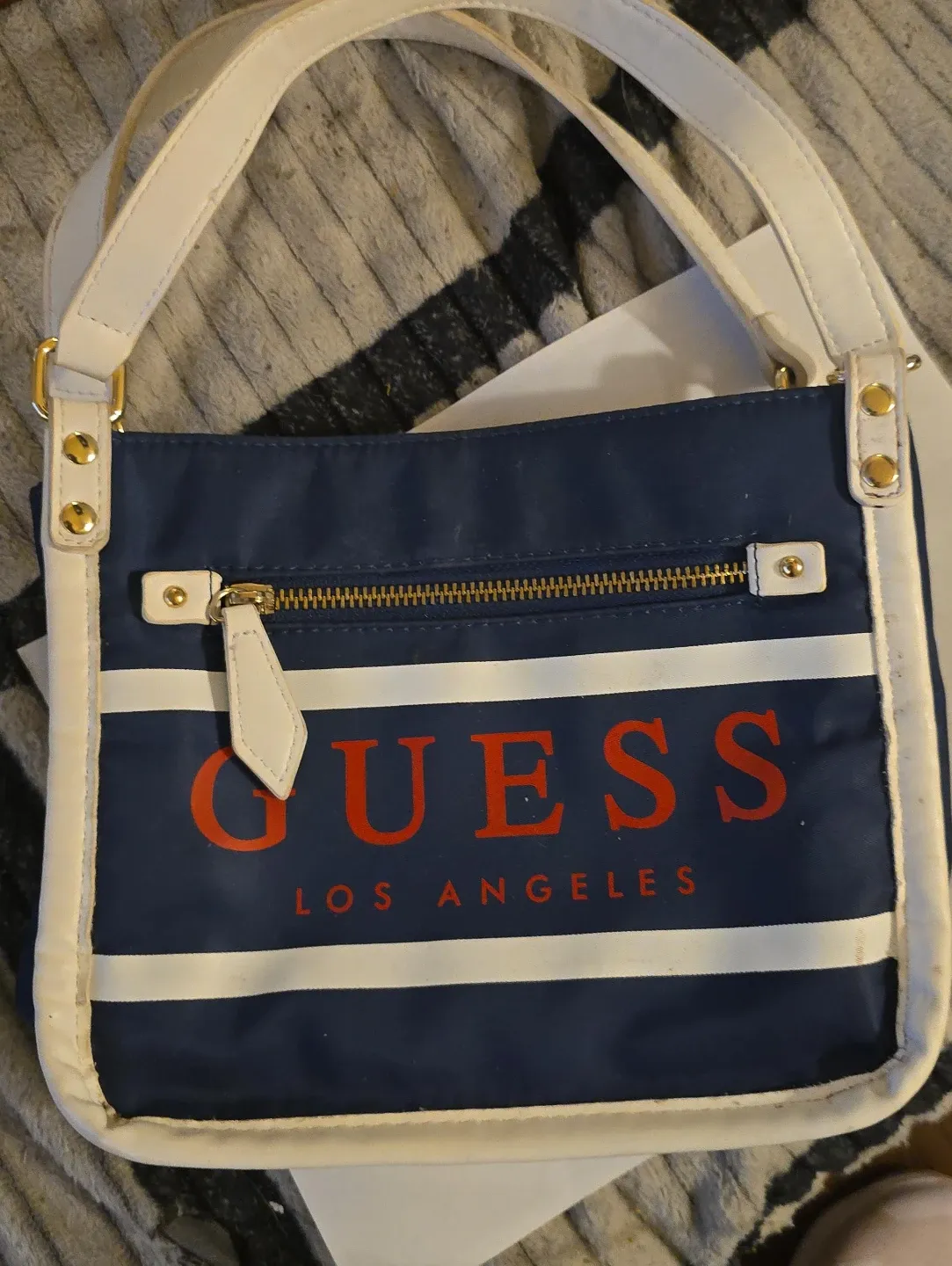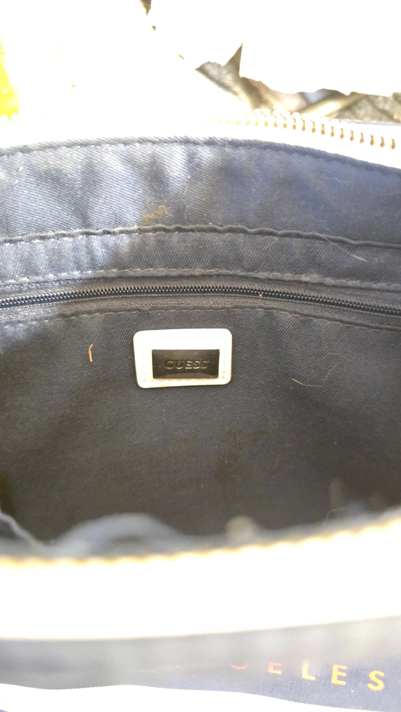 This Guess crossbody bag is navy blue with white trim and straps. It features the Guess logo prominently on the front. The interior has multiple compartments for organization.