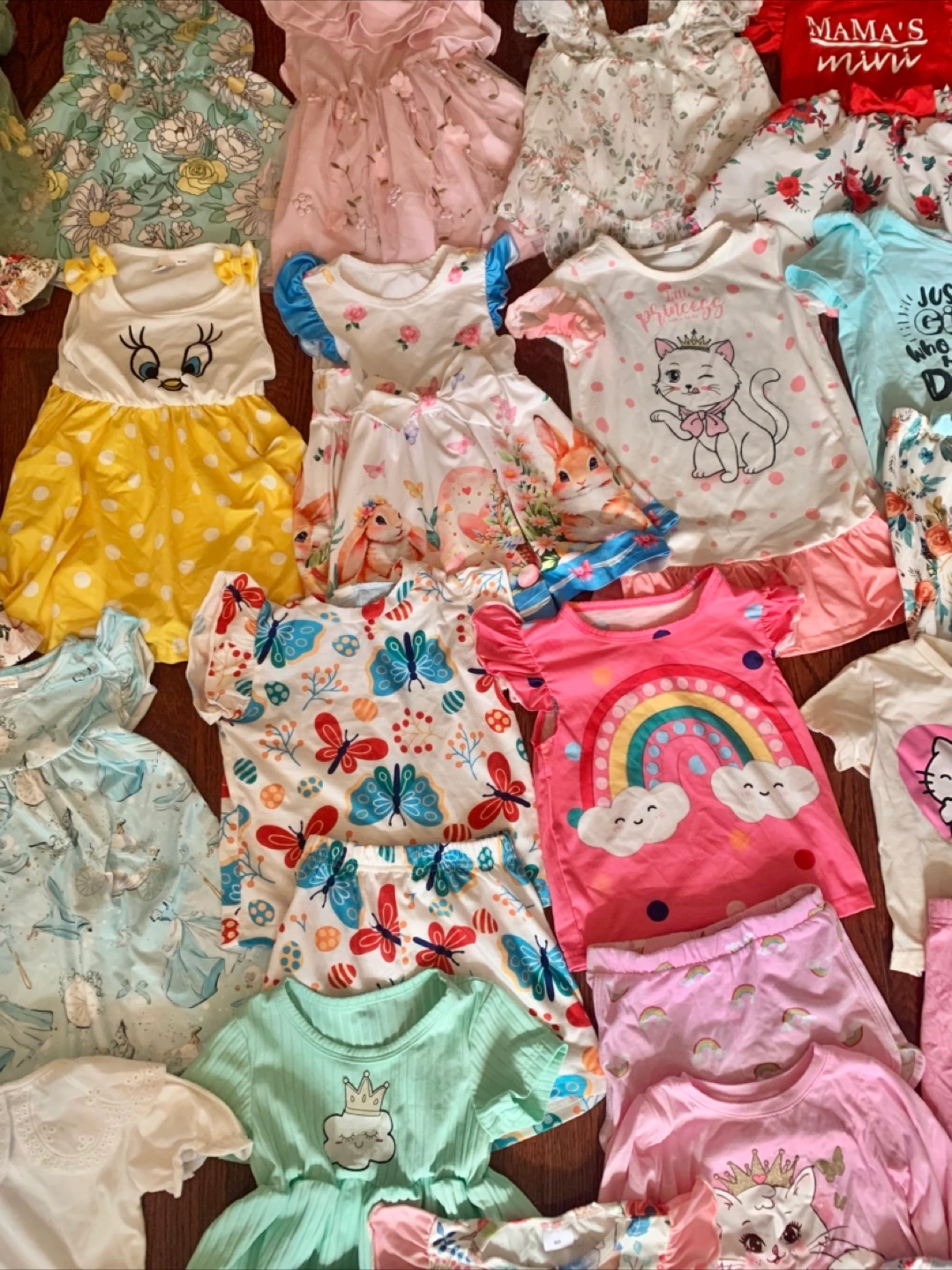 Selling a bundle of mixed girls' clothing. There are dresses, tops, and sets in various colours and patterns. Perfect for a growing wardrobe! Sizes are for 18-24 months. Each outfit is $5 or take everything for $100