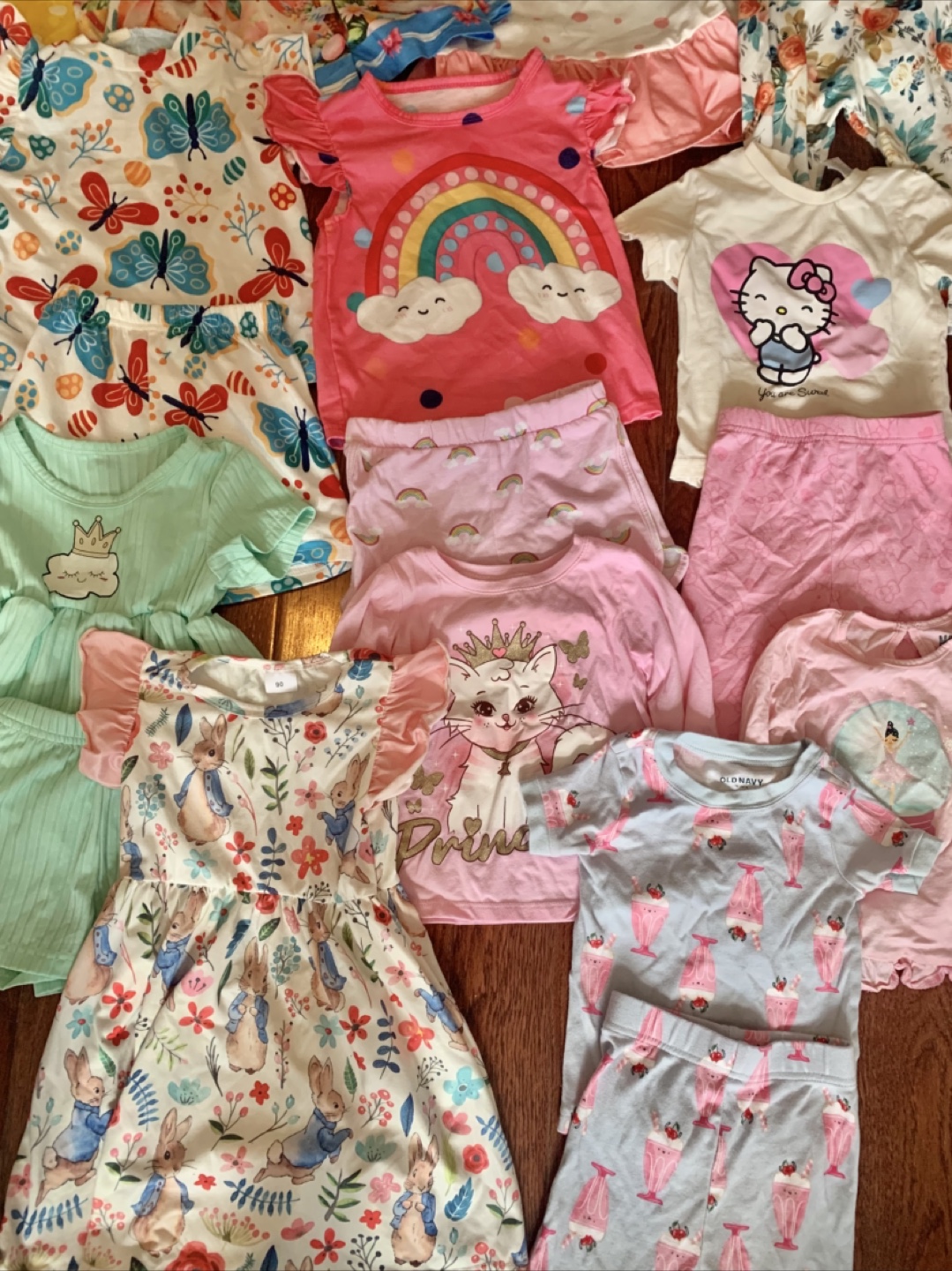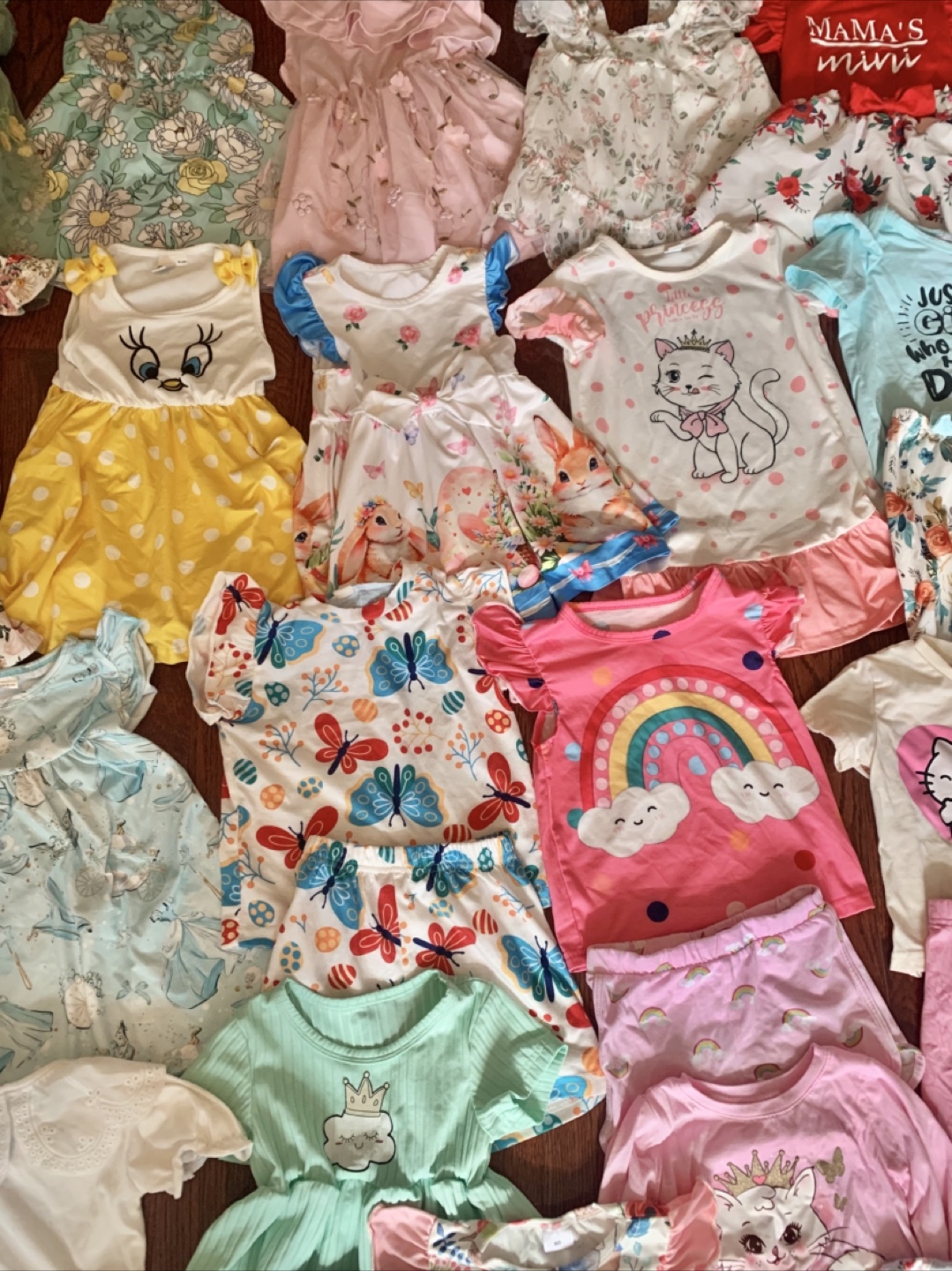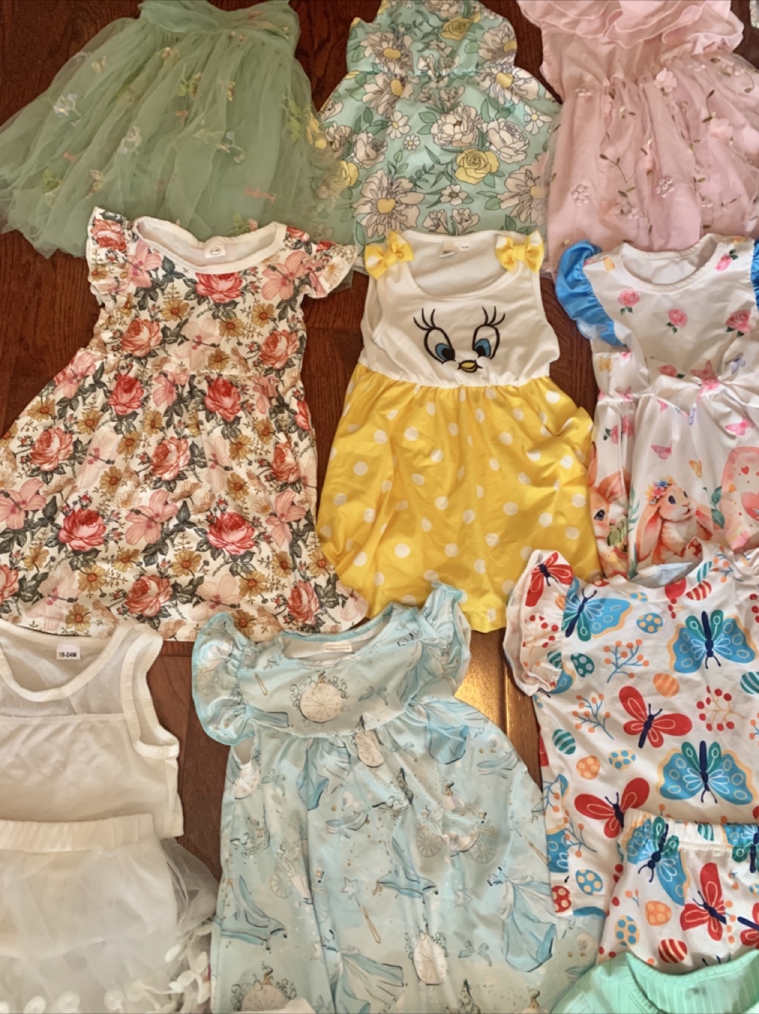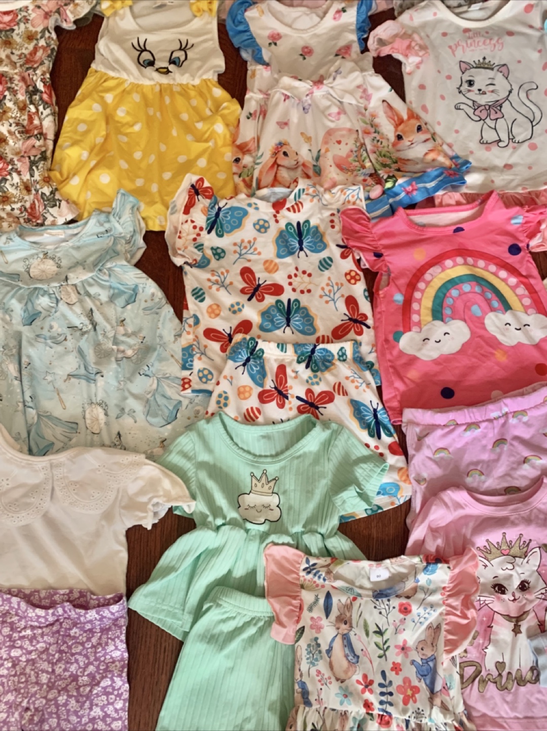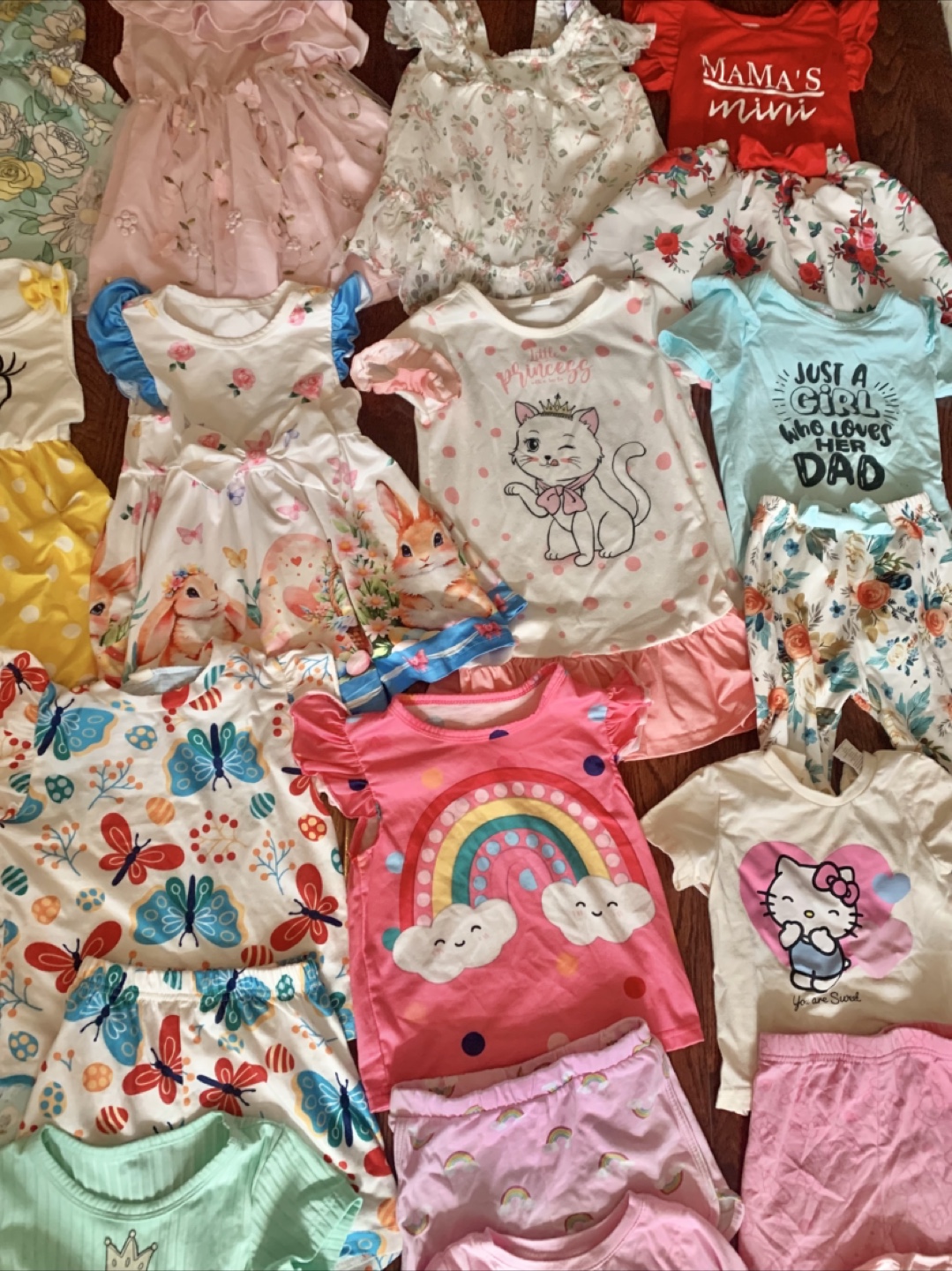 Selling a bundle of mixed girls' clothing. There are dresses, tops, and sets in various colours and patterns. Perfect for a growing wardrobe! Sizes are for 18-24 months. Each outfit is $5 or take everything for $100