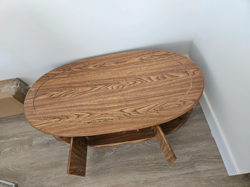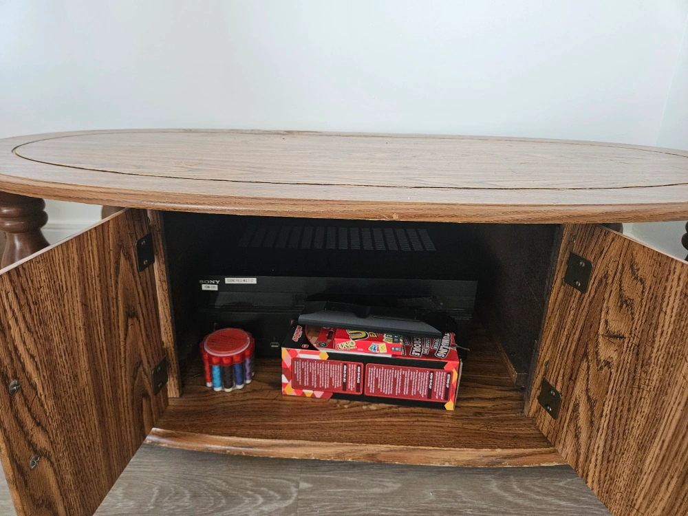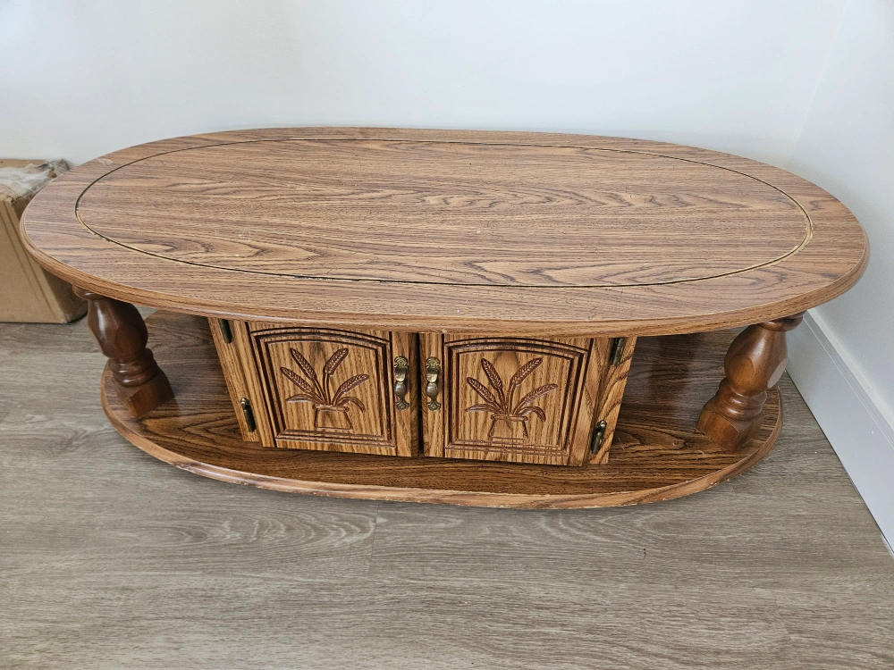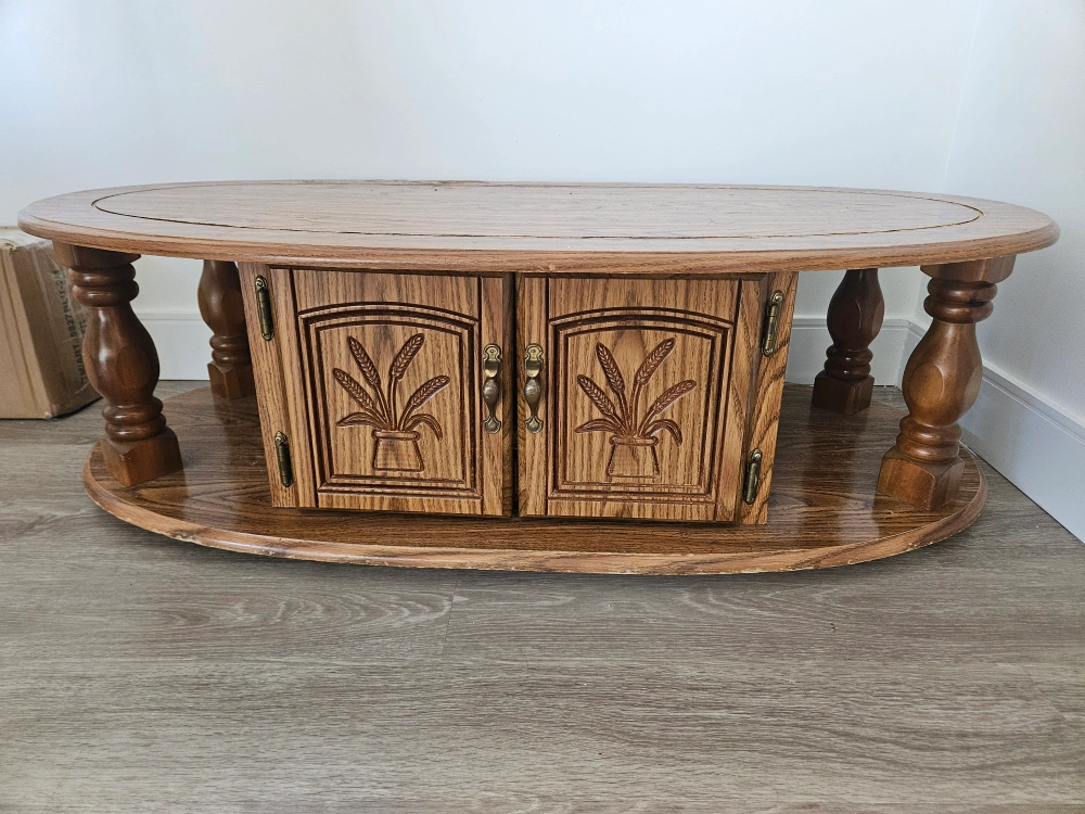 Selling a lovely vintage oval coffee table made of oak. It features a storage compartment with doors, perfect for keeping things tidy. The table has a classic design with carved details on the doors and a lower shelf for extra storage or display. It's a great piece to add some character to your living room!