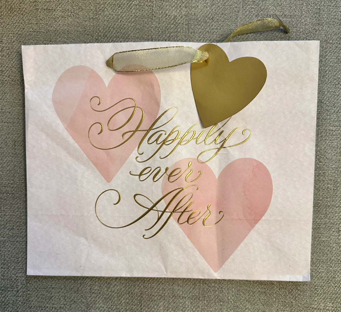 This Hallmark gift bag features a "Happily Ever After" design with pink hearts and gold lettering. It's made with paper sourced from responsibly managed forests. Includes a ribbon handle and tissue paper.