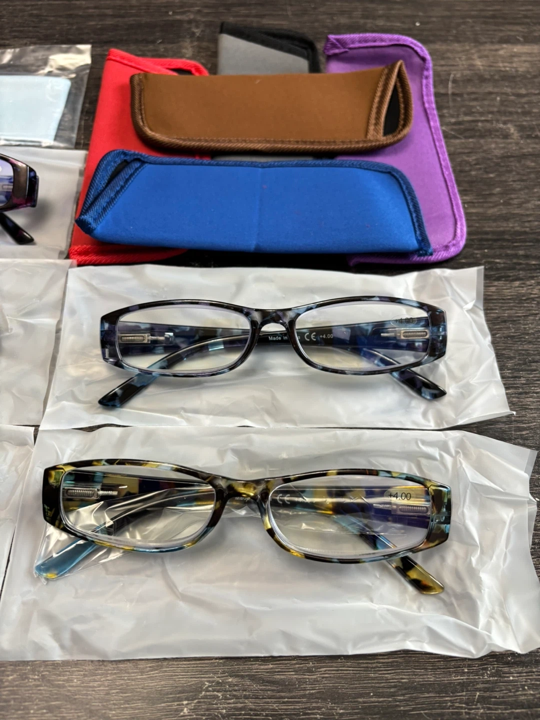 🔥Selling a lot of six pairs of reading glasses with +4.00 magnification. Frames have tortoise shell and patterned designs. Includes cleaning cloths and multiple carrying cases. These are good for sharp reading vision!