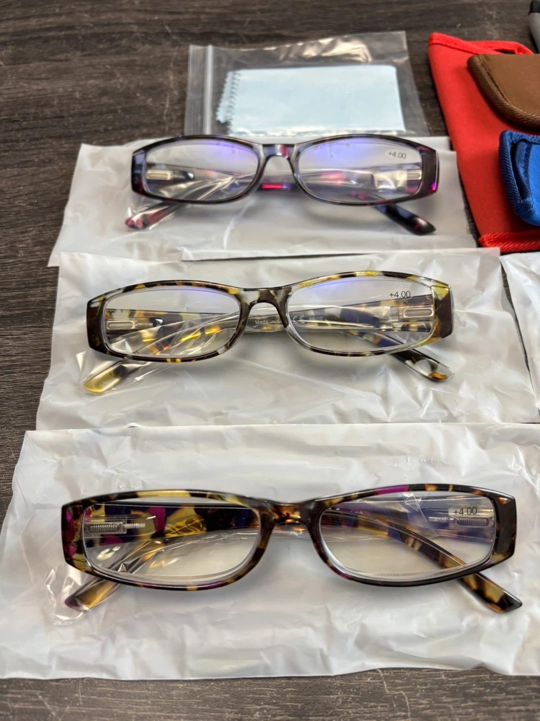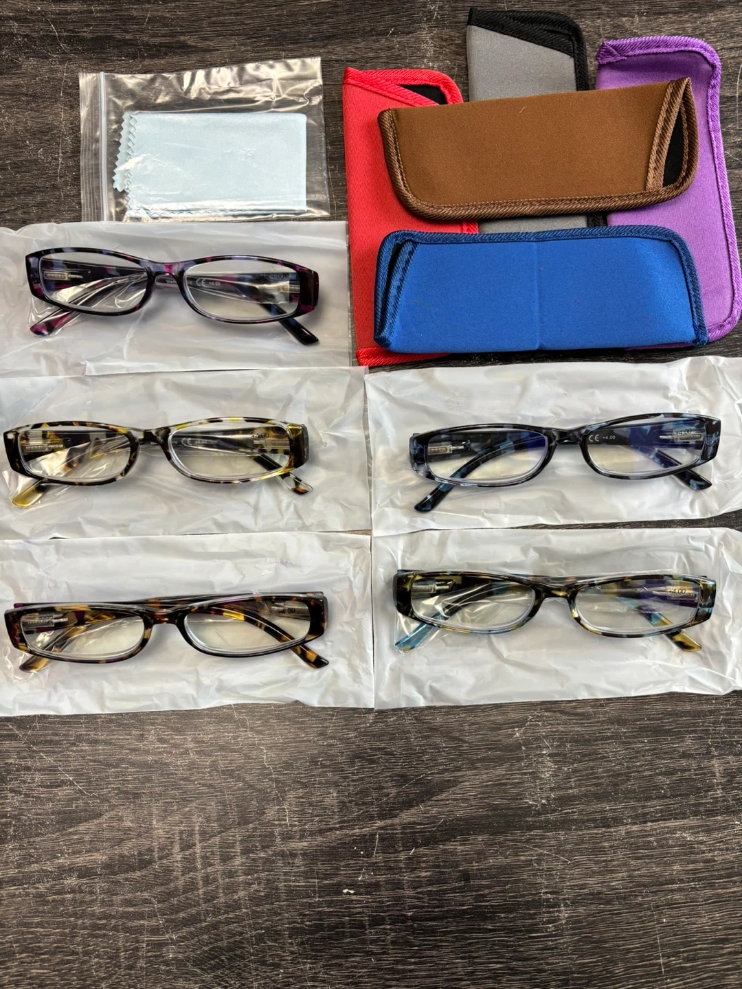 🔥Selling a lot of six pairs of reading glasses with +4.00 magnification. Frames have tortoise shell and patterned designs. Includes cleaning cloths and multiple carrying cases. These are good for sharp reading vision!