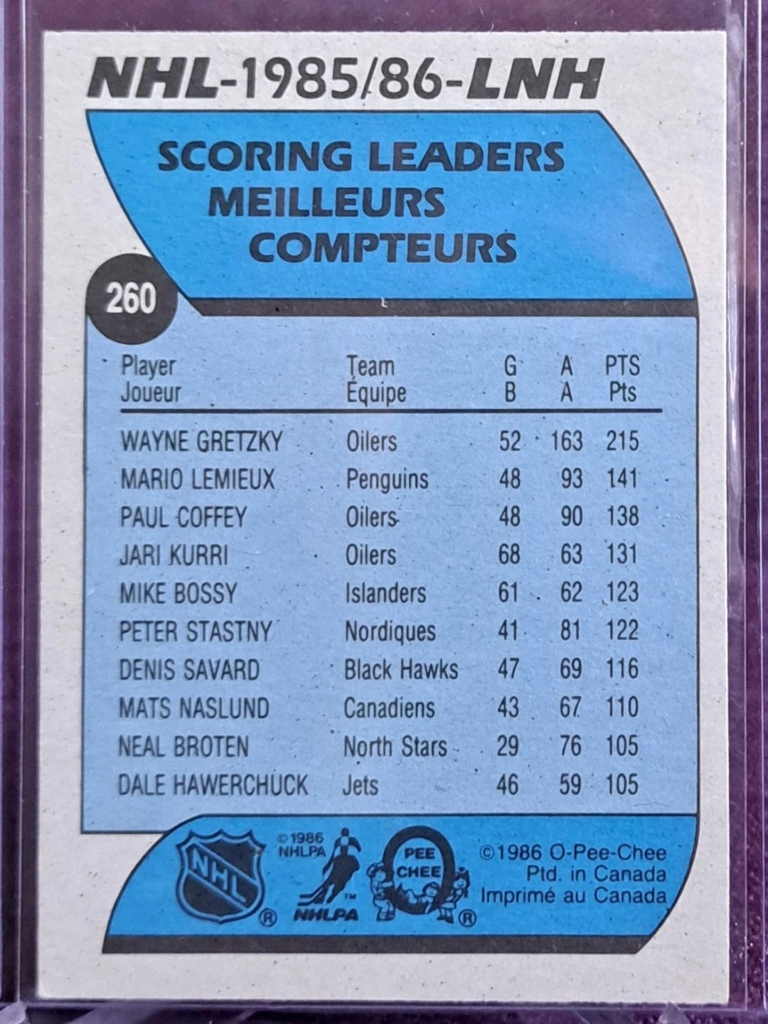 Ungraded - Near Mint or Better. Standard size 1986-87 O-Pee-Chee hockey card featuring Wayne Gretzky, Card #260, the scoring leader. Original O-Pee-Chee card from Canada.