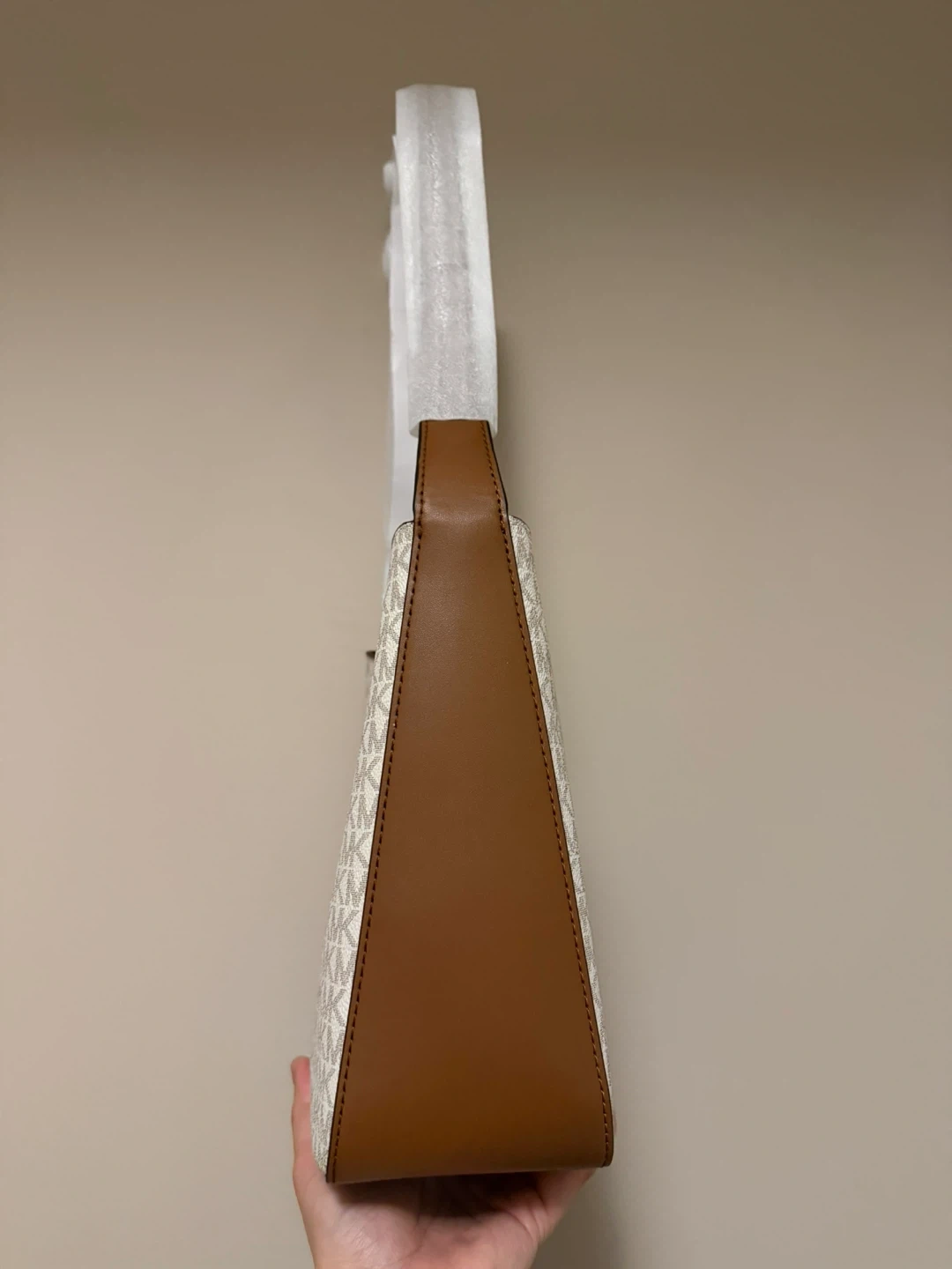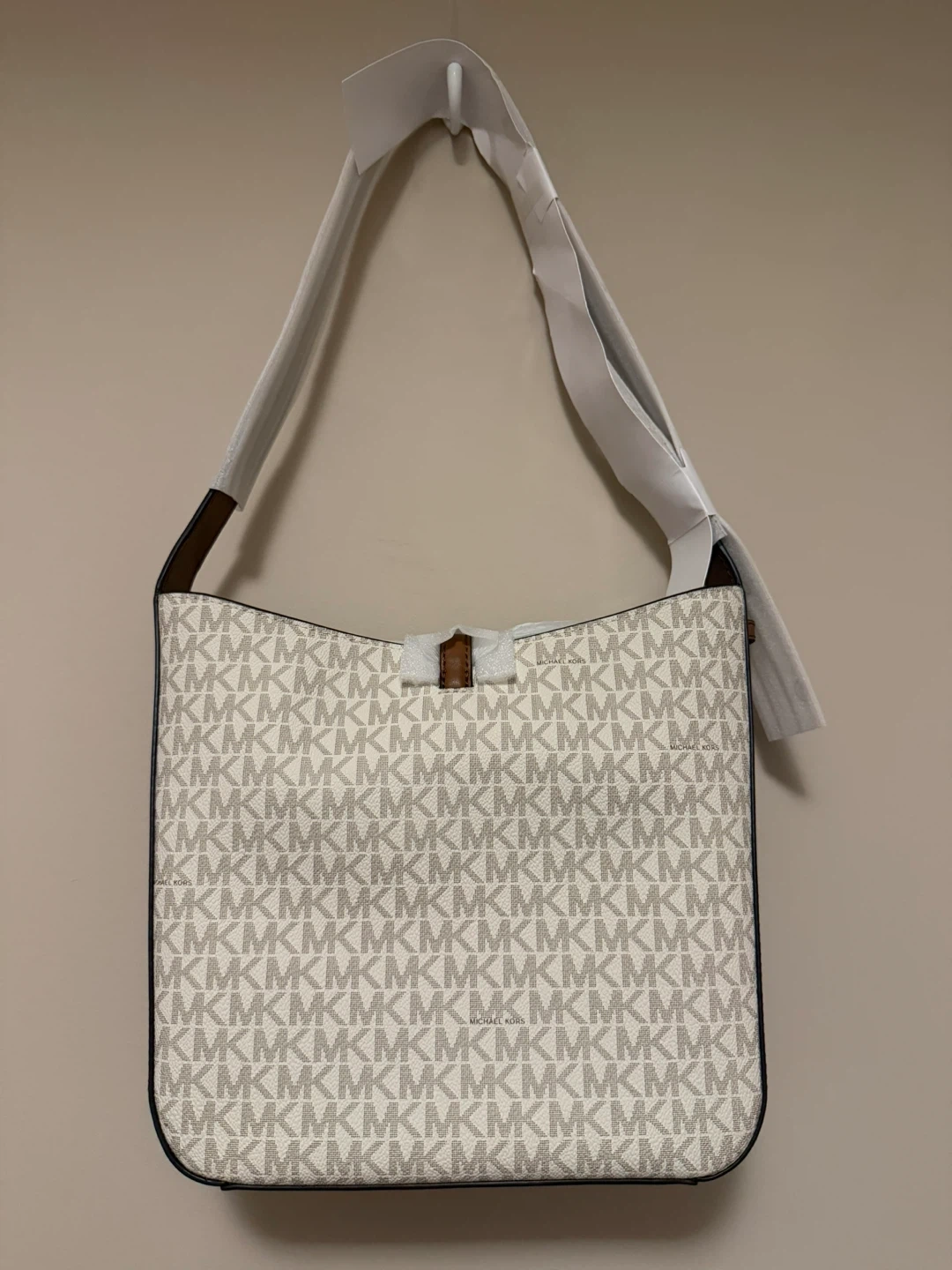 This is a brand new Michael Kors shoulder bag in Vanilla color. It features the signature MK logo pattern in beige and white with brown leather accents. This bag is perfect for everyday use!