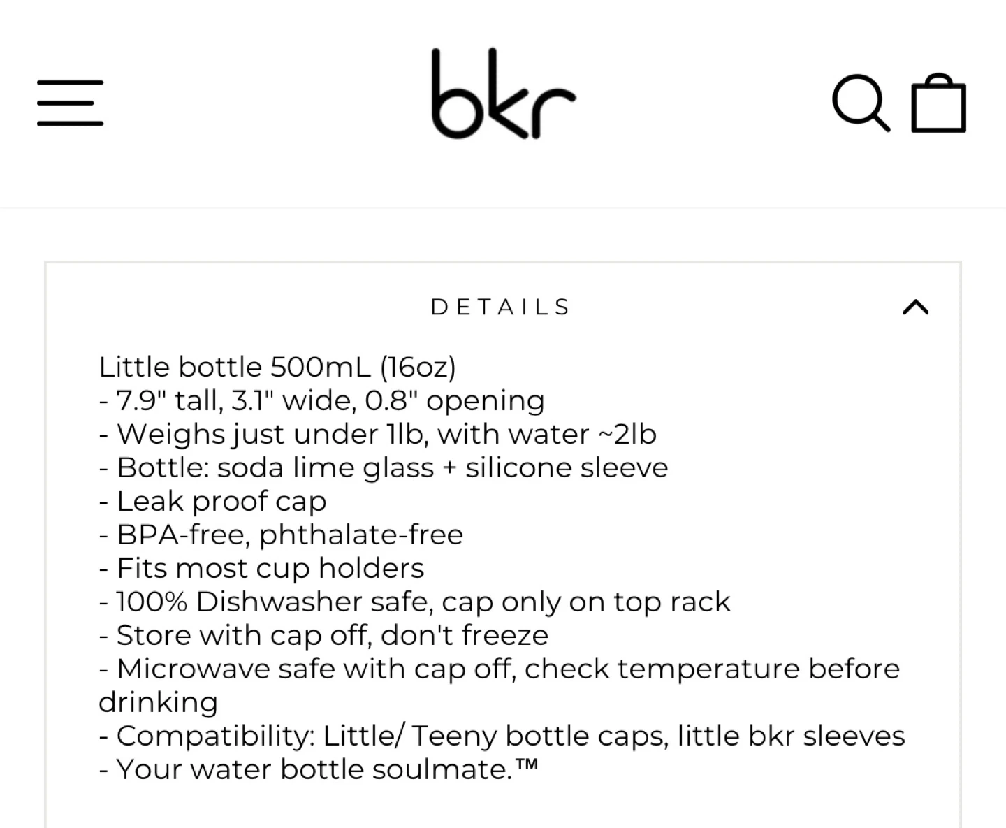 It's 7.9" tall, 3.1" wide, with a 0.8" opening and weighs just under 1lb. The bottle is made of soda lime glass and a silicone sleeve. It's also BPA-free and phthalate-free!