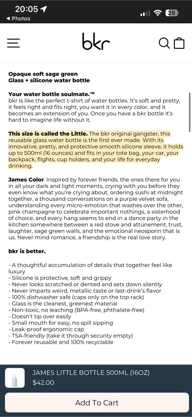 Selling a bkr Little Bottle in a soft lavender color! It's a 500ml (16oz) glass water bottle with a silicone sleeve. ($42 new)