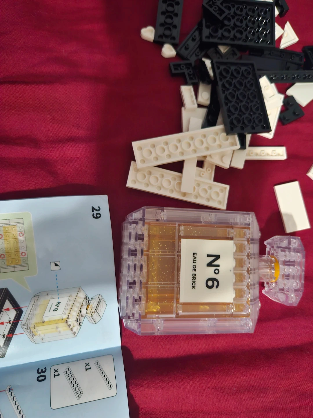 This is a set of building blocks that assemble into a clear perfume bottle with gold glitter inside. It's labelled "N°6 EAU DE BRICK". Instructions are included for assembly.