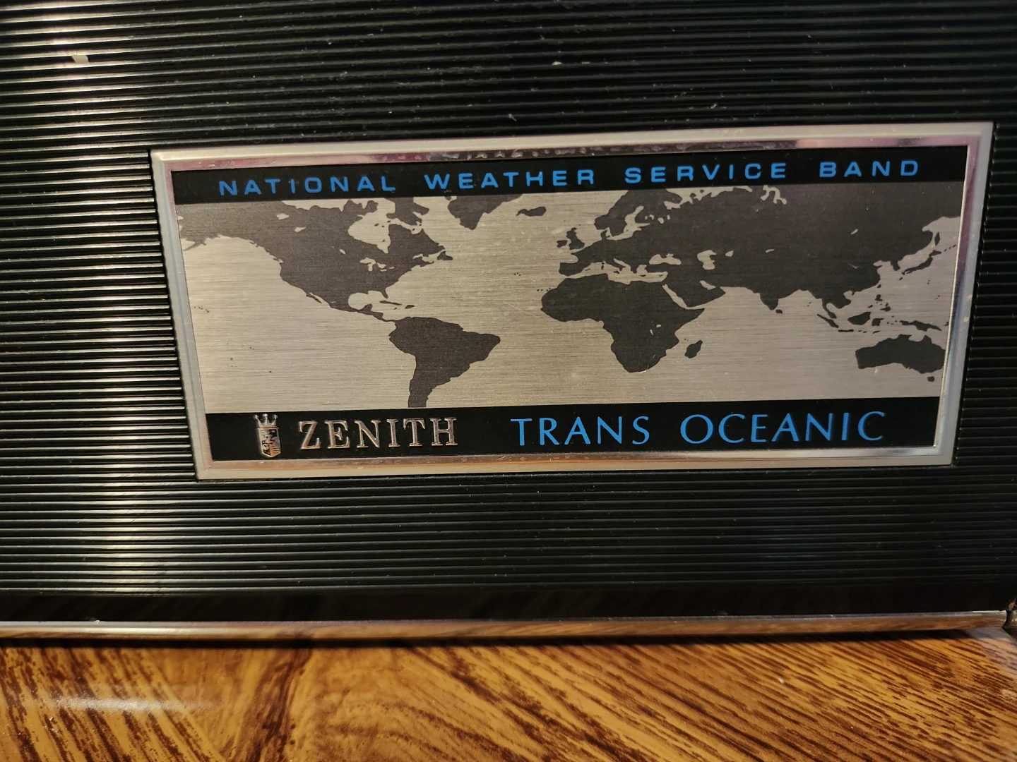 This Zenith Trans-Oceanic radio features AM, FM, and shortwave bands. It's a solid-state model with a built-in compass wheel and world map for navigation. The radio includes controls for tuning and band selection as well as the original instruction and guide booklet.