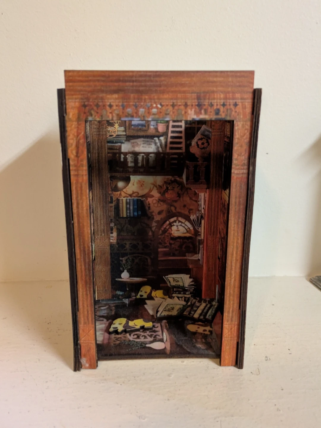 This is a miniature book nook kit, designed to look like an 'Eternal Bookstore'. It features a detailed interior with bookshelves and scattered books.