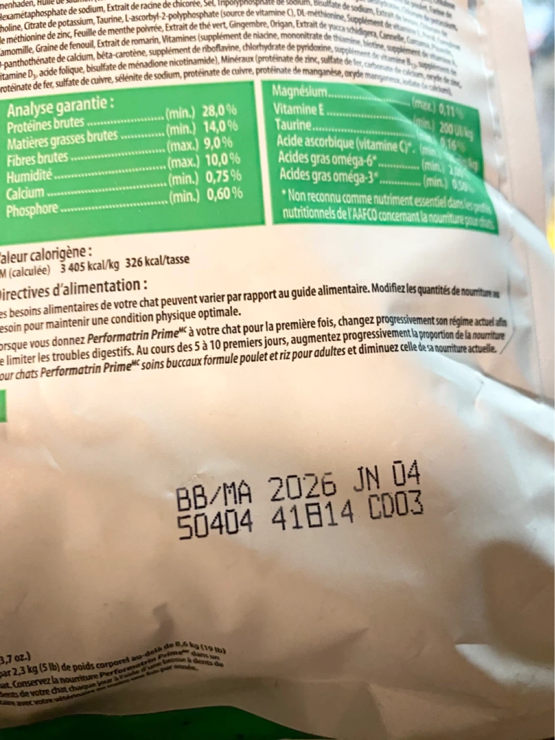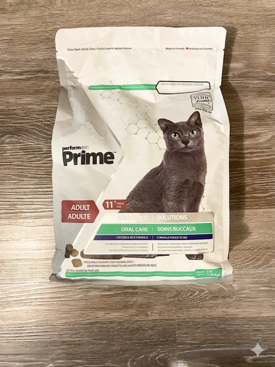 Performatrin Prime Adult cat food, chicken & rice formula. It's designed for oral care with a kibble designed for dental health. Contains 11 essential nutrients.