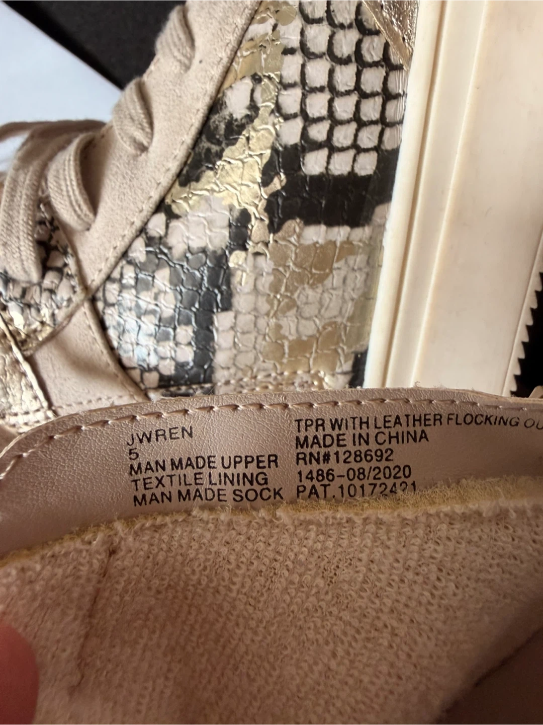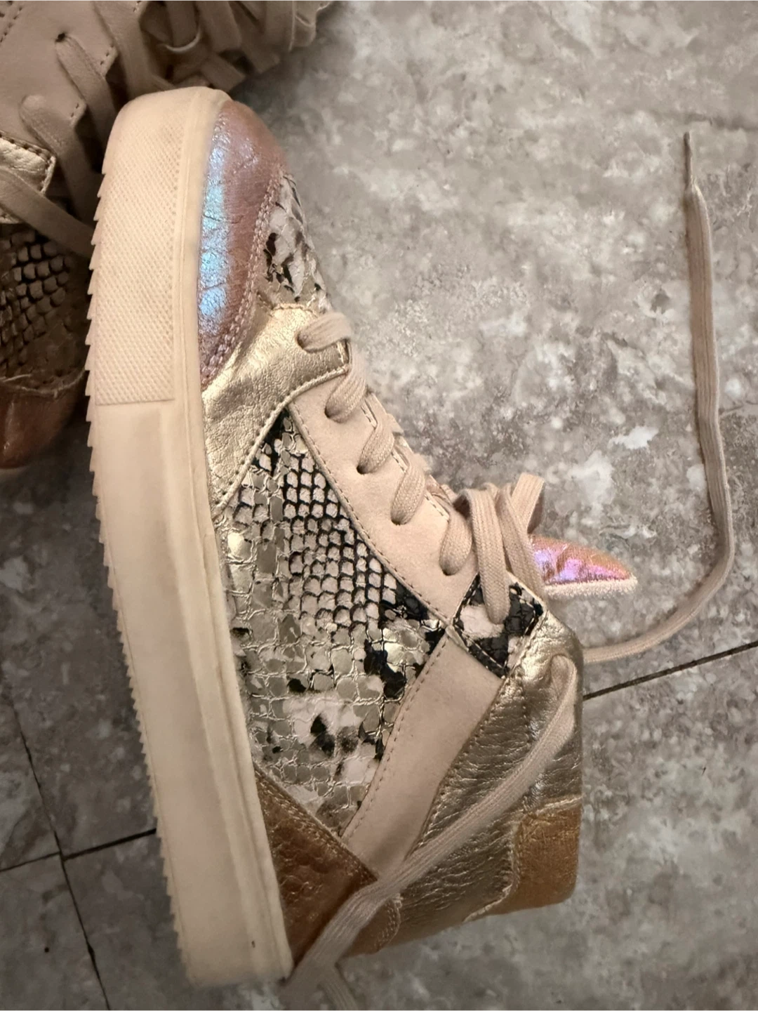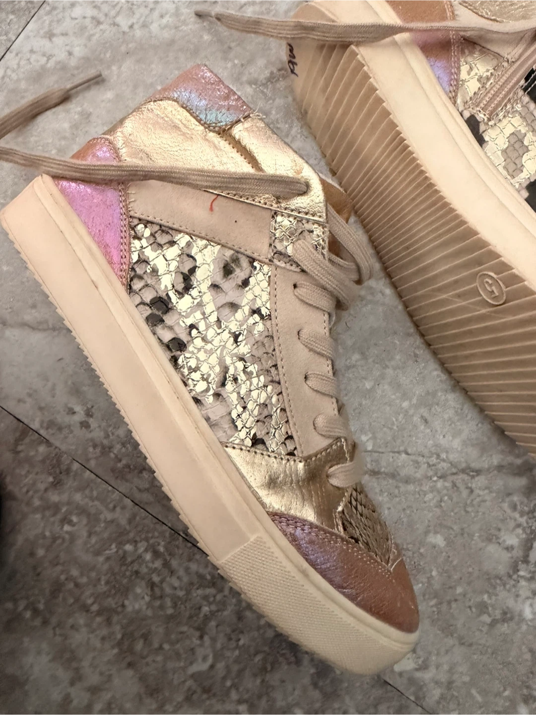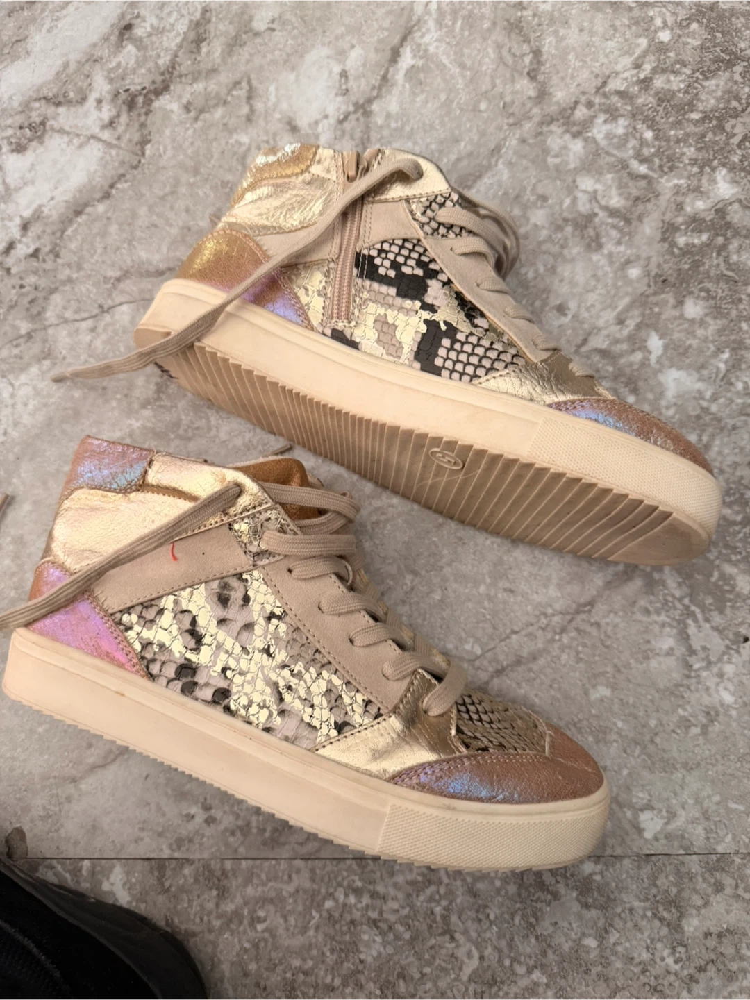 These stylish high-top sneakers feature a mix of snake print and metallic gold accents. They have a comfortable lace-up closure with a side zipper for easy on and off. Perfect for adding a unique touch to any casual outfit!