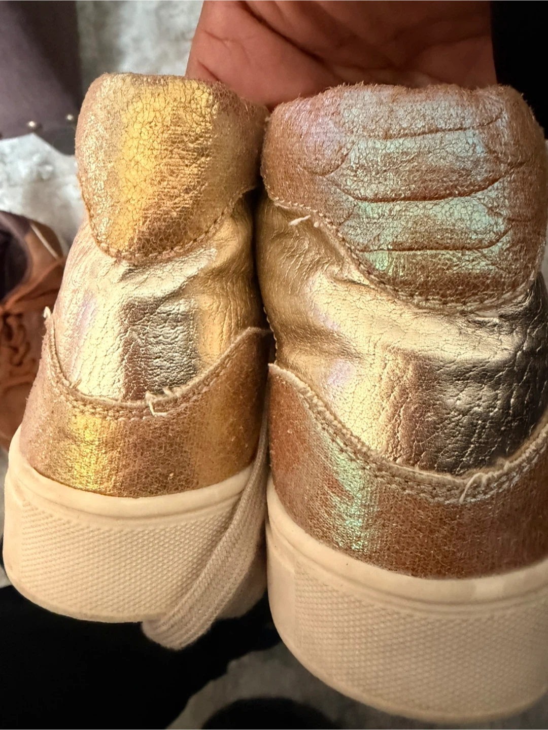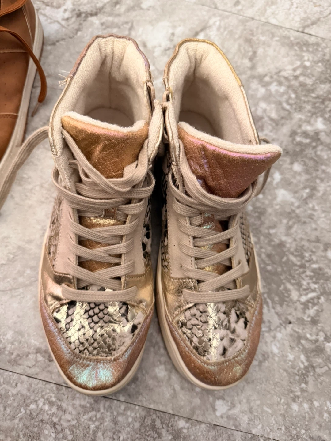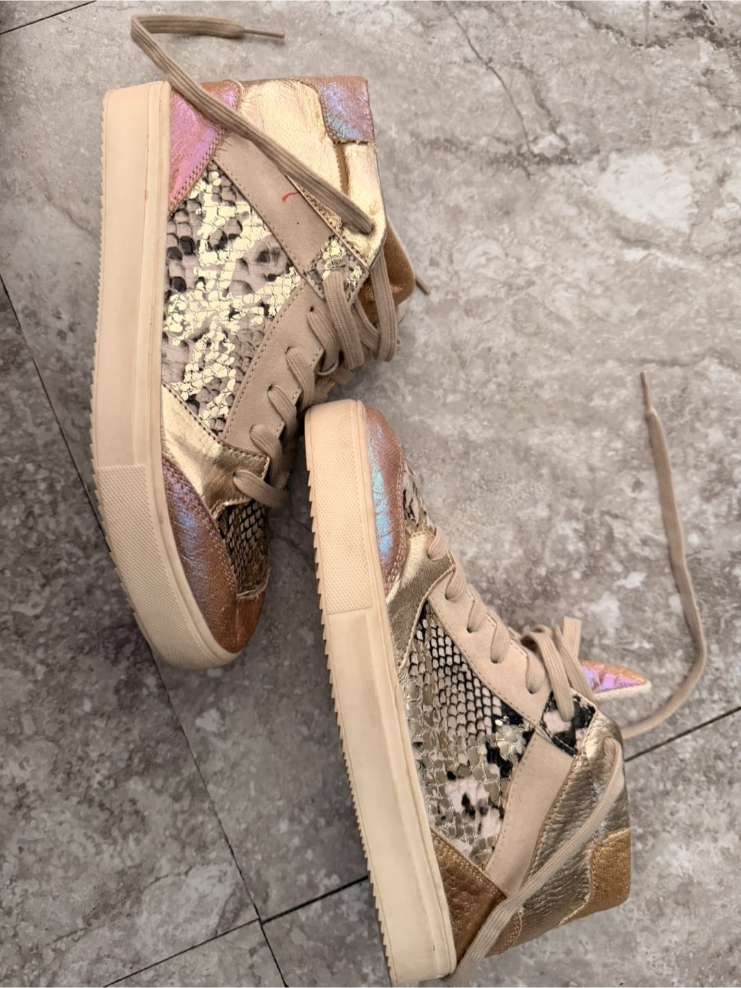 These stylish high-top sneakers feature a mix of snake print and metallic gold accents. They have a comfortable lace-up closure with a side zipper for easy on and off. Perfect for adding a unique touch to any casual outfit!