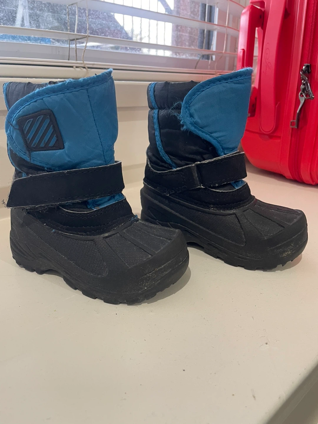 Children's black and blue snow boots with velcro closures. These boots are designed for cold weather. They're perfect for keeping little feet warm and dry on snowy days!