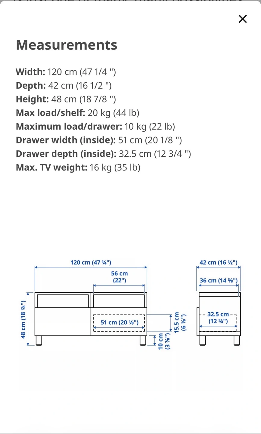 • Inside drawer: 51 cm × 32.5 cm (20 1/8” × 12 3/4”)