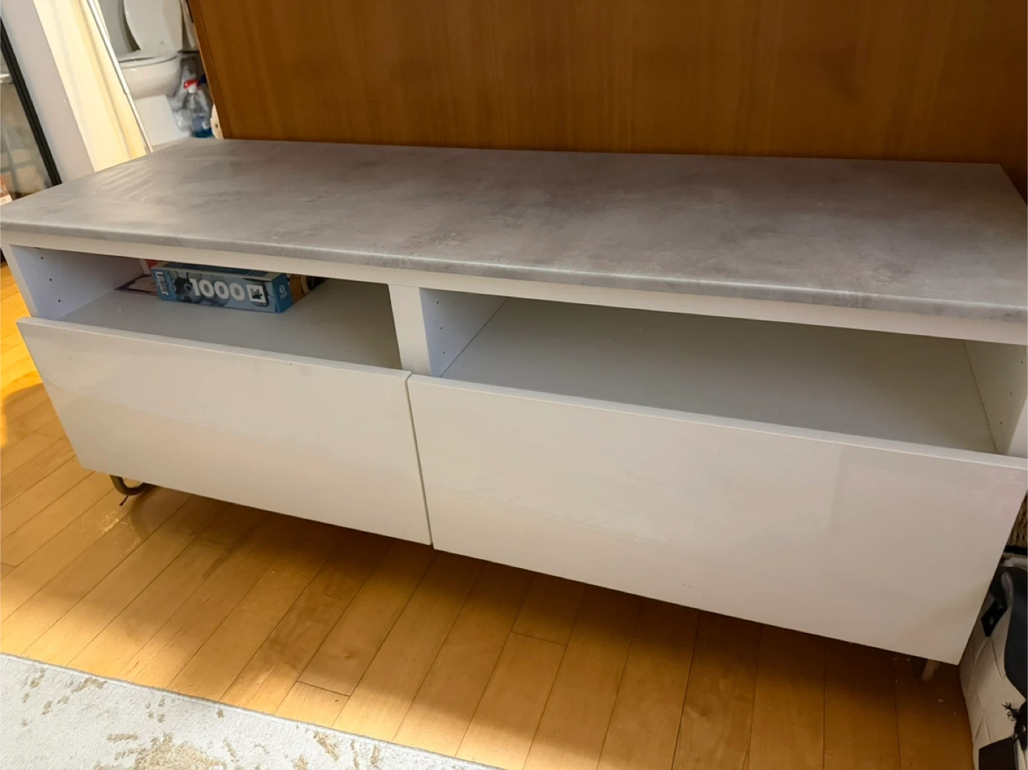 Not only is the condition excellent and like new with no scratches, dents or damage but it also has a modern minimalist design. With metal feet and a sleek grey top, this TV bench is well dressed and ready for your at home dates nights watching movies or game days being there to help cheer your team on.