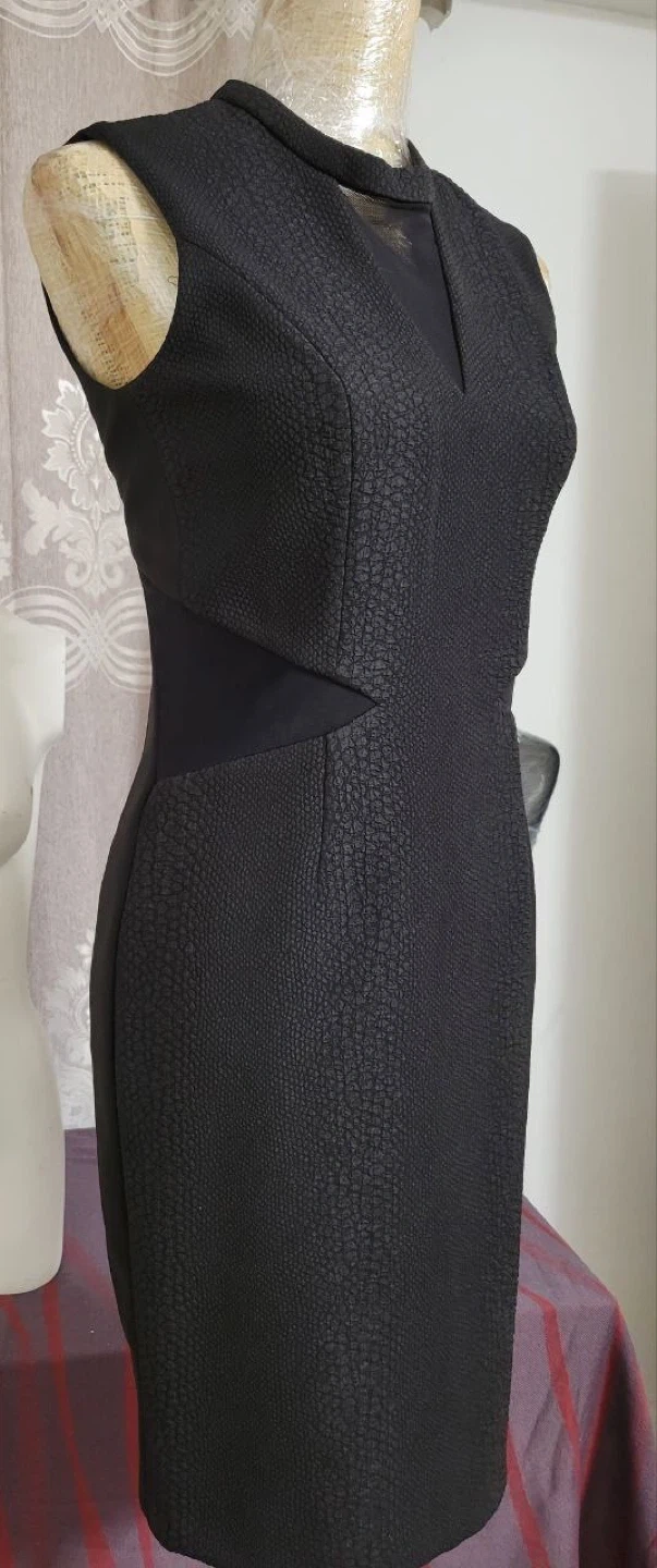Selling a stylish black dress with a unique textured pattern. It has a flattering silhouette and a modern design. Perfect for a night out or a special occasion