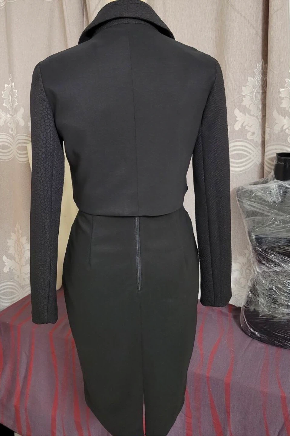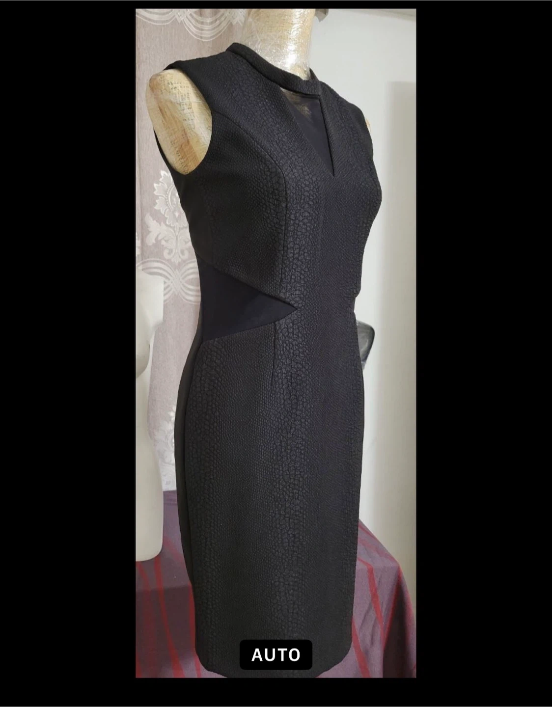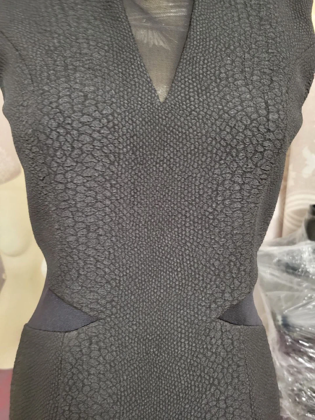 Selling a stylish black dress with a unique textured pattern. It has a flattering silhouette and a modern design. Perfect for a night out or a special occasion