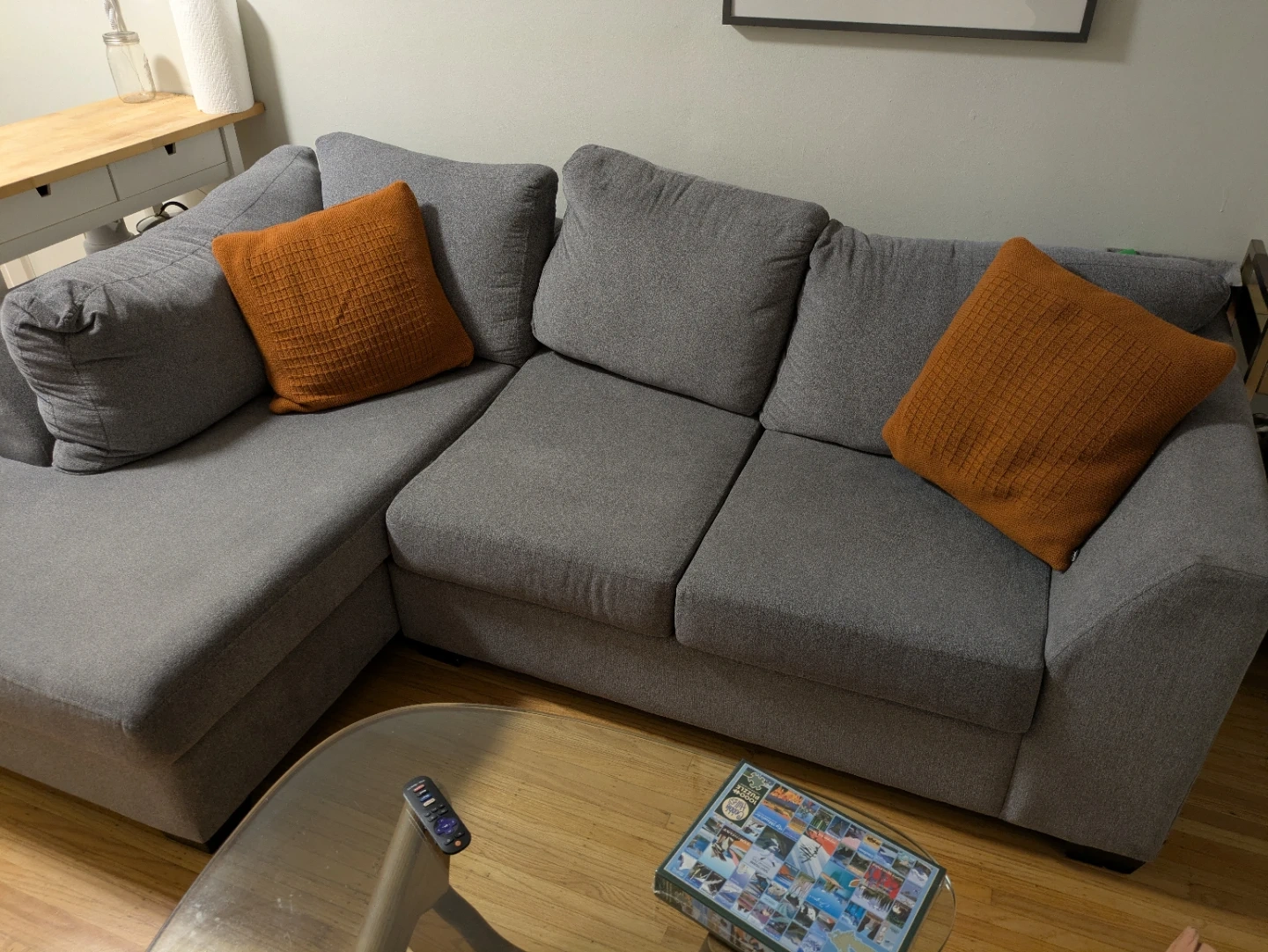Moving Sale!! This is a comfortable grey sectional sofa. It comes with two textured orange accent pillows.