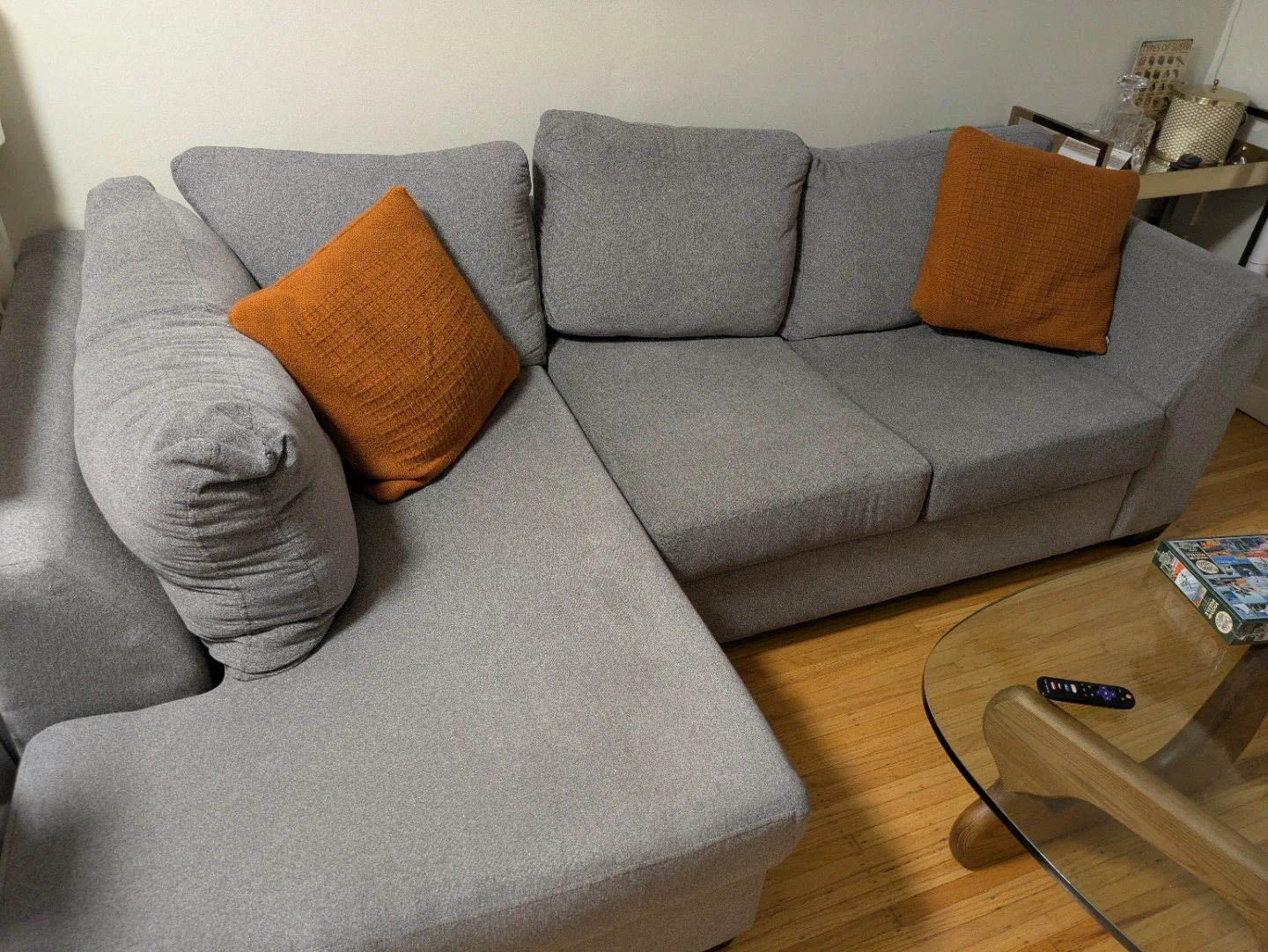 Moving Sale!! This is a comfortable grey sectional sofa. It comes with two textured orange accent pillows.