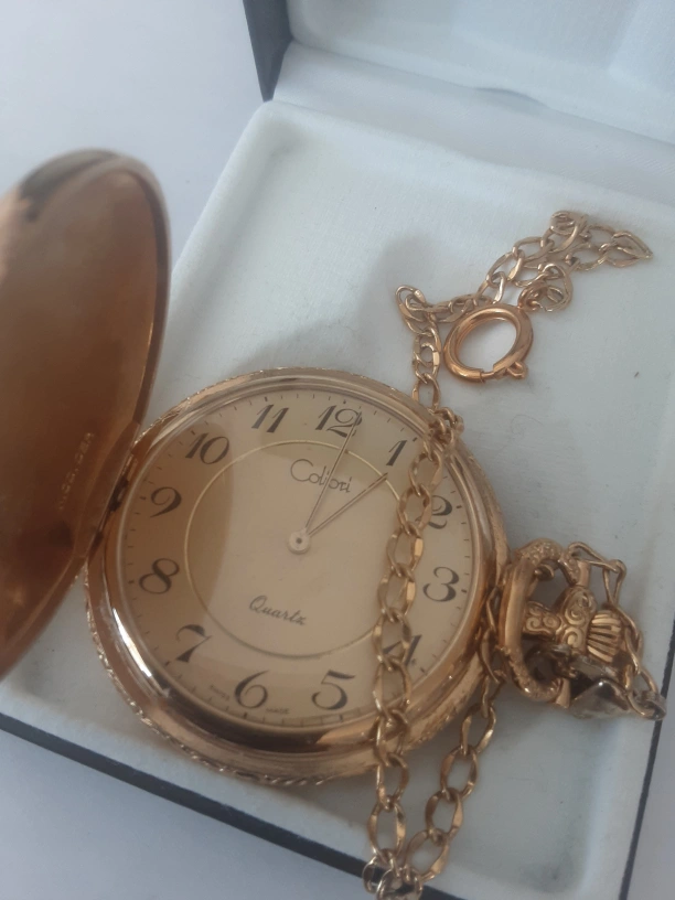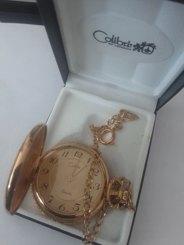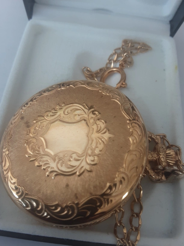 Gold-toned pocket watch with chain. works great, nice watch. $125.00 for viewing call 403 2411387 have other watches for sale