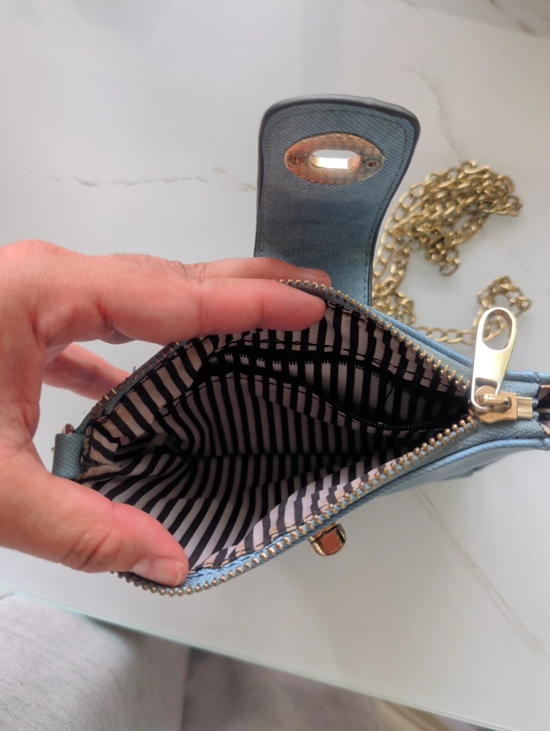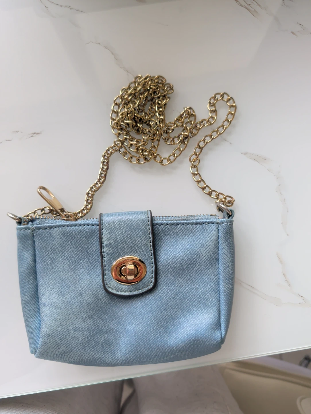 Buy & SellLight Blue Denim Crossbody Bag with Gold ChainLight Blue Denim Crossbody Bag with Gold Chain$9A small, light blue denim crossbody bag. It features a turn-lock closure and a gold-tone chain strap. The interior has a striped lining.ConditionOkayWHERE TO MEETStarbucksView MapSELLERverifiedmariaMariners Harbor600 reviews0 chats·0 favorites·3 viewsSEND CHAT TO SELLERHi maria! I’m interested in your listing.Hi maria! I’m interested in your listing.Get the Karrot app to chatSign In to chat