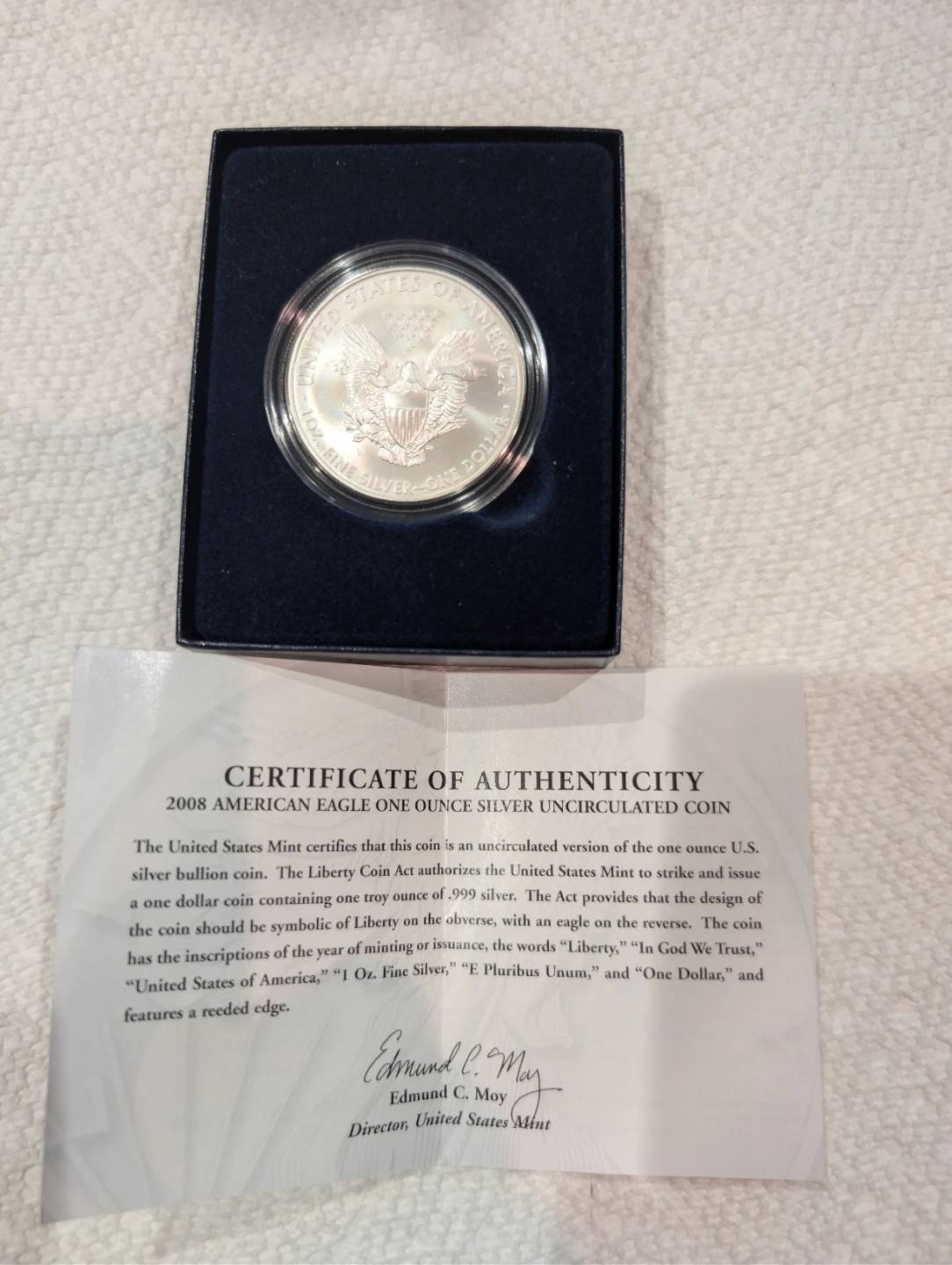 This is a 2008 American Eagle one ounce silver uncirculated coin. It's made of 99.9% silver and has a balance copper composition. It comes in its original box with a certificate of authenticity. Content Silver 0.999 Troy ounce (31.072 grams) mint in West Point.