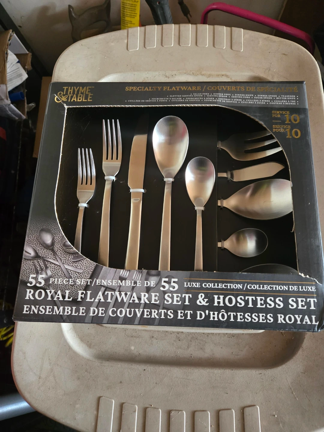 Selling a Thyme & Table 55-piece Royal Flatware Set & Hostess Set! The set is a luxe collection and serves 10 people. It includes specialty flatware/couverts de spécialité such as salad forks, dinner forks, dinner knives, dinner spoons, teaspoons, slotted serving spoons, and serving forks