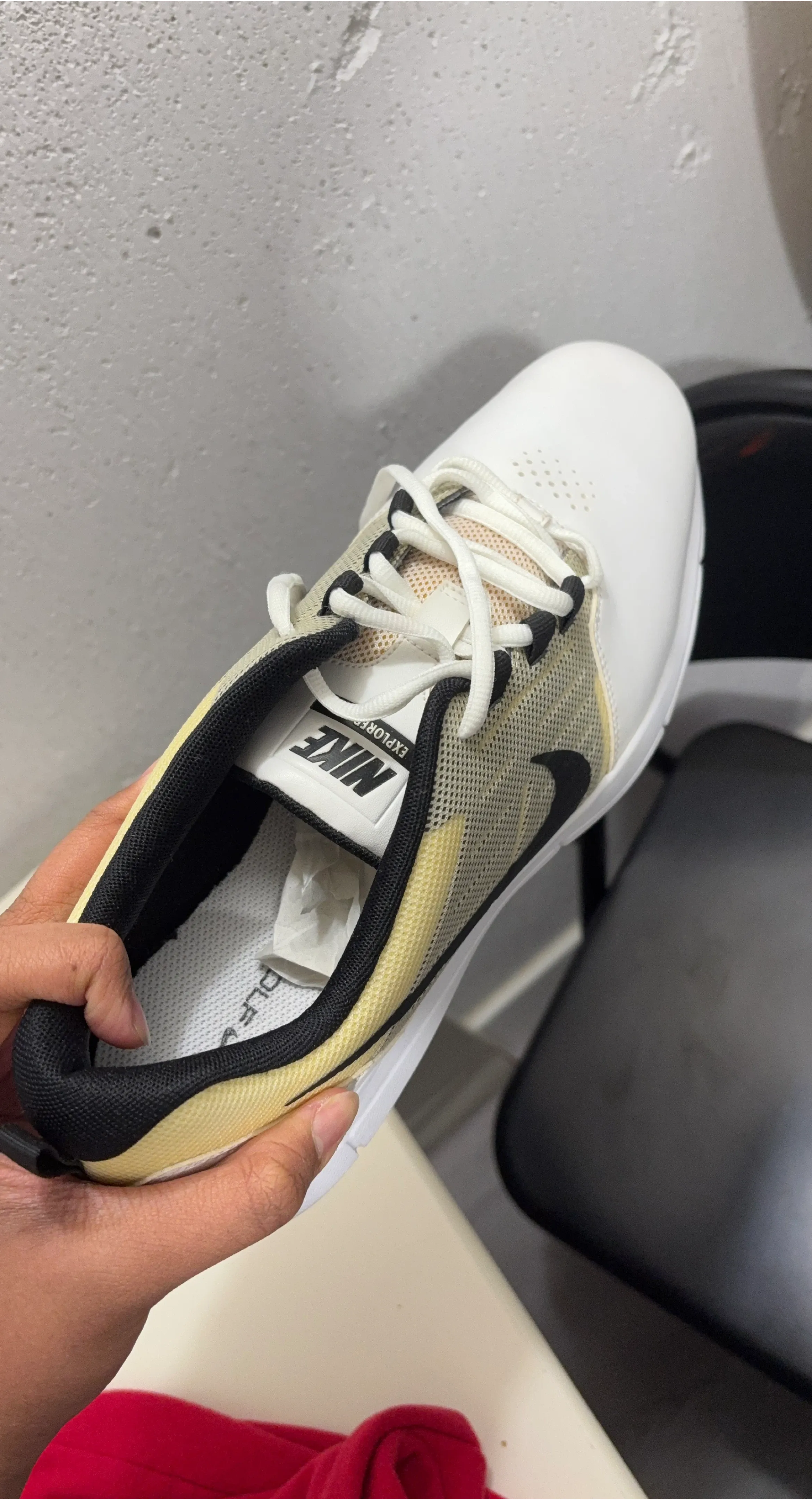 These Nike Explore golf shoes are white with black and yellow accents. They're designed for comfort and performance on the course. The material is a mix of synthetic leather and mesh. reason for sale its too big for me