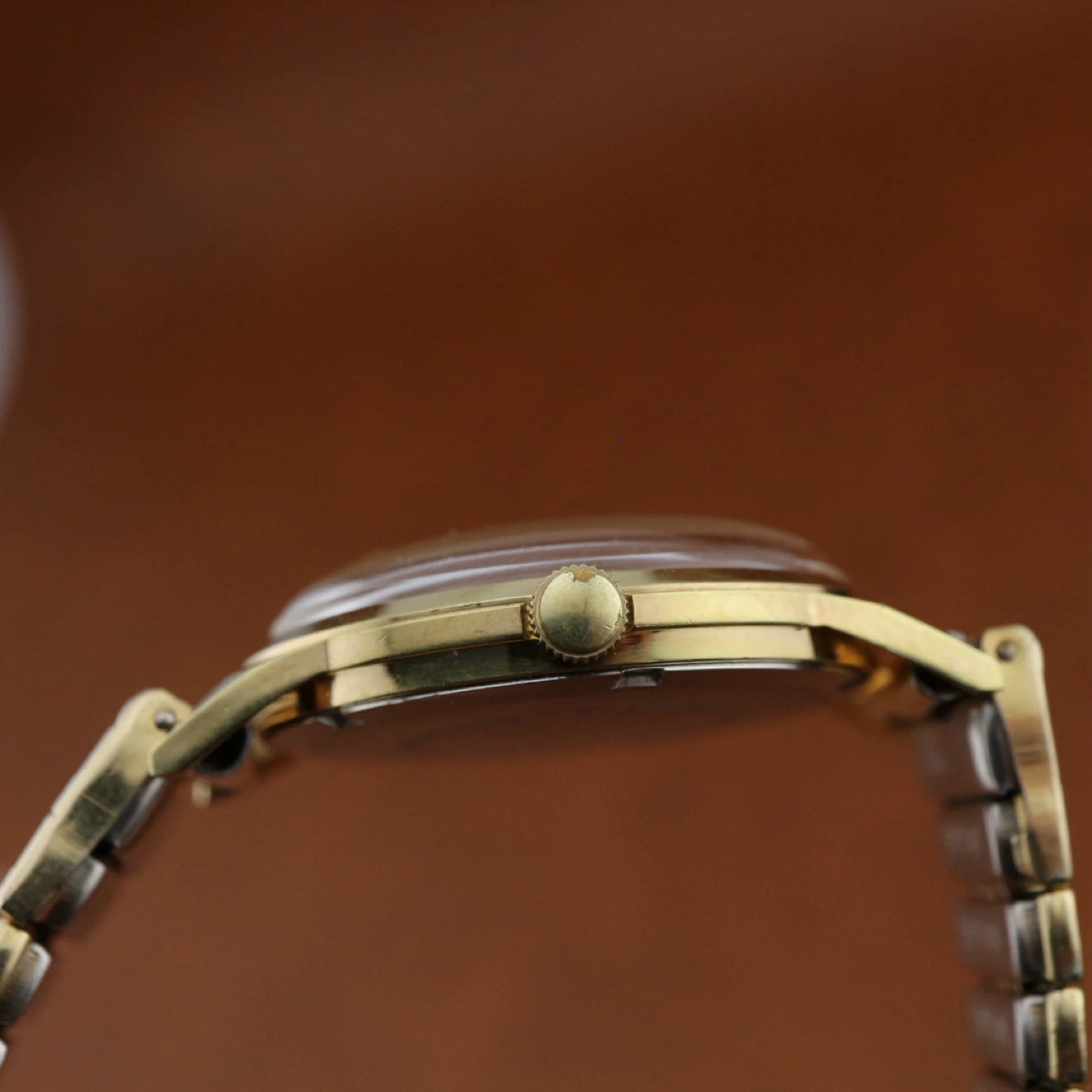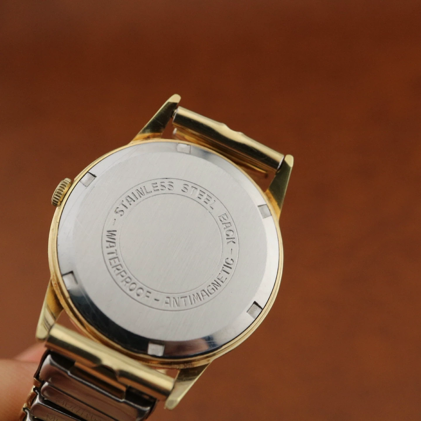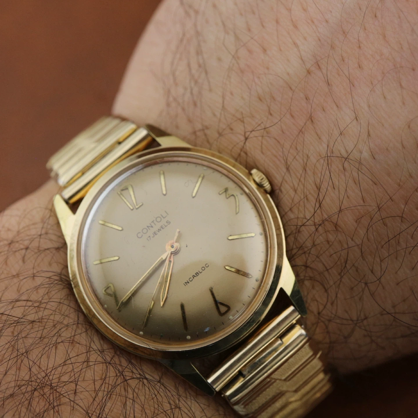 This is a vintage Contoli watch with 17 jewels. It features a gold-tone case and bracelet. The back is stainless steel, water-resistant, and antimagnetic. It's a classic timepiece.
