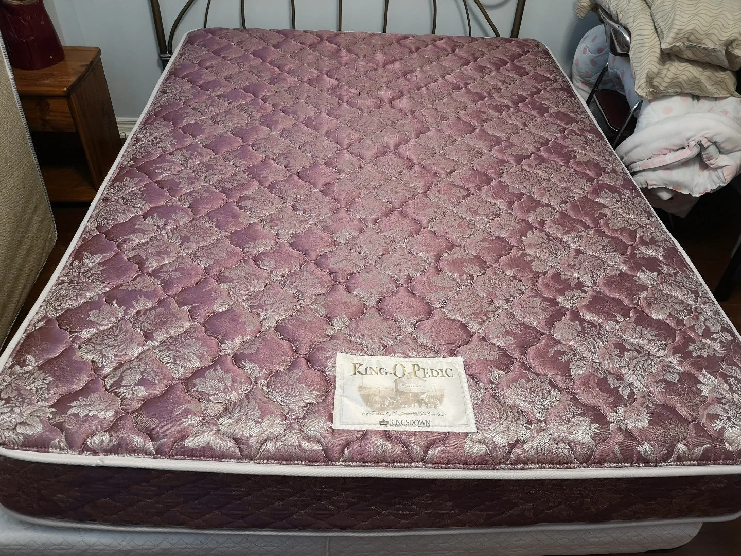 Used King-O-Pedic double mattress. Purple floral pattern. Good condition. Kingsdown label.