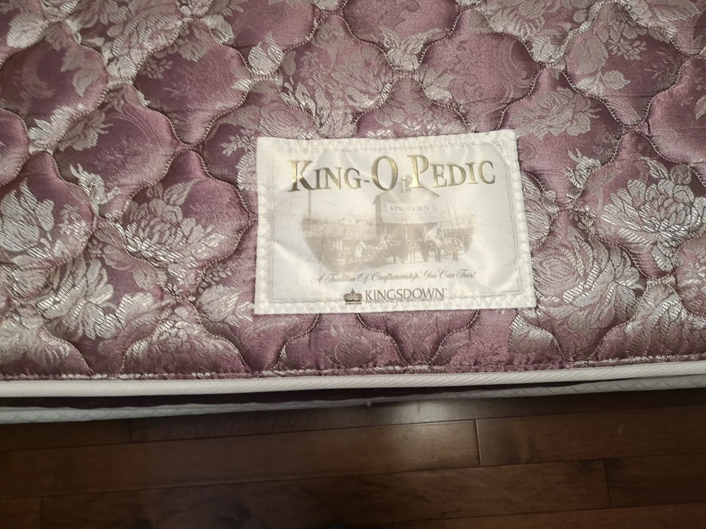 Used King-O-Pedic double mattress. Purple floral pattern. Good condition. Kingsdown label.