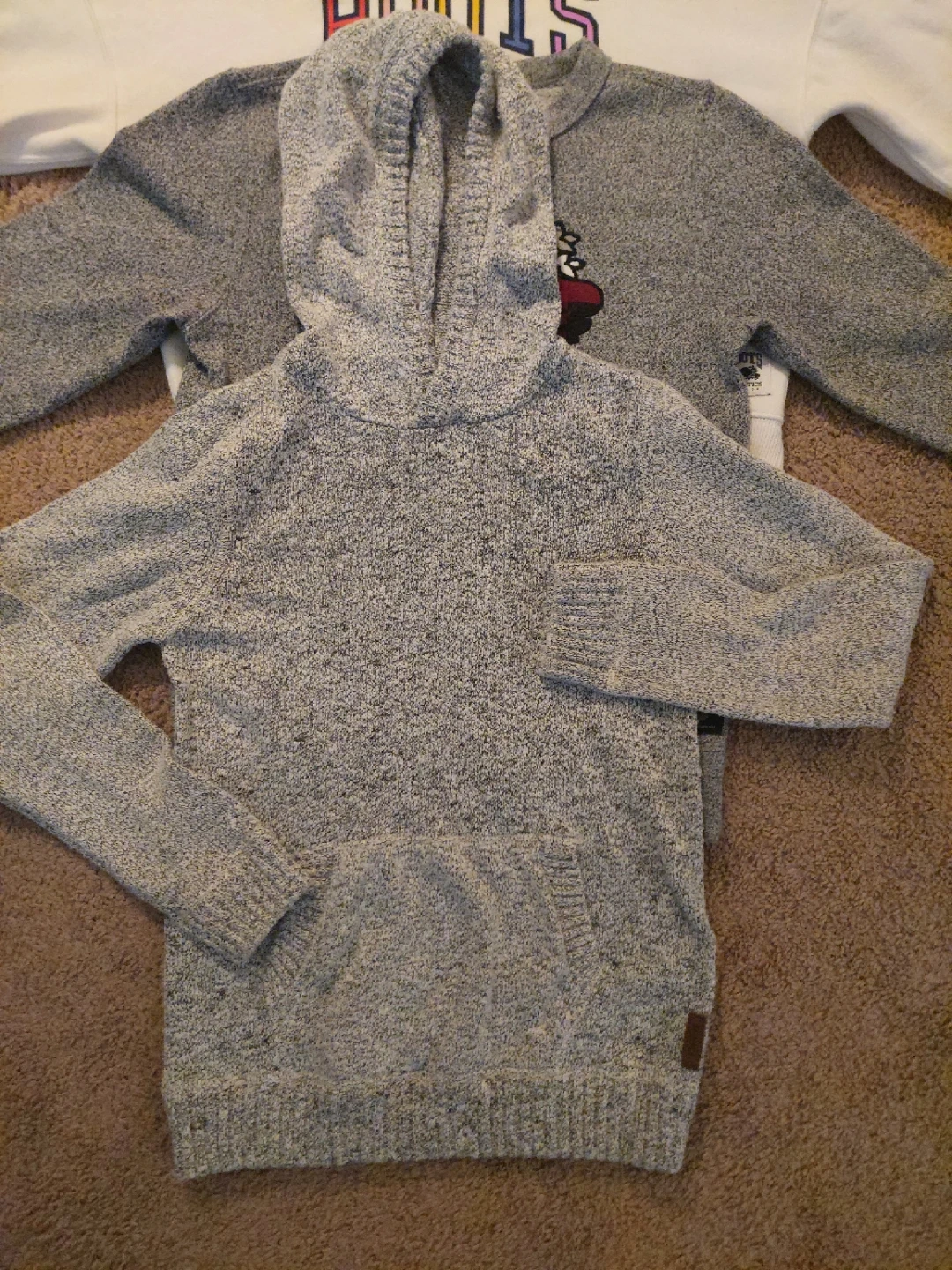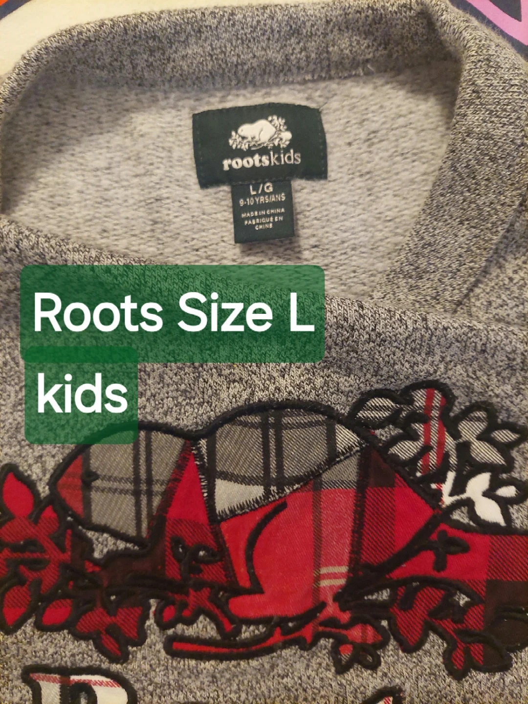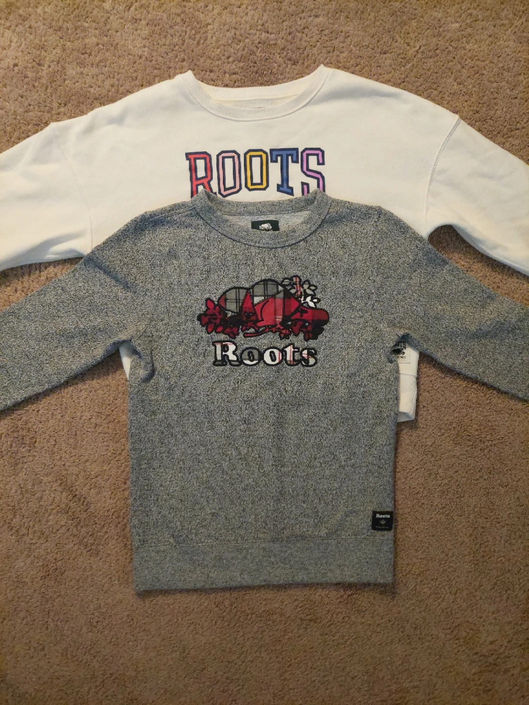 Selling three Roots kids sweatshirts. One is a cream colour with the classic Roots logo, size XL (11-12 yrs). The other is a grey colour with a plaid Roots logo, size L (9-10 yrs). The last one is a hoodie, 🧂 🌶 Grey, size Large. All in Excellent, Like New, condition! $15 each. Better price for all 3.