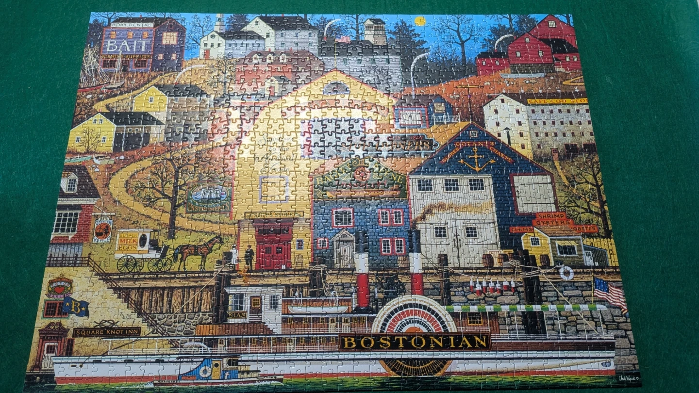 This Buffalo Games jigsaw puzzle features Charles Wysocki's artwork, 'The Bostonian'. It has 1000 pieces and is designed for adults. The image depicts a charming coastal town scene with various buildings and a steamboat.