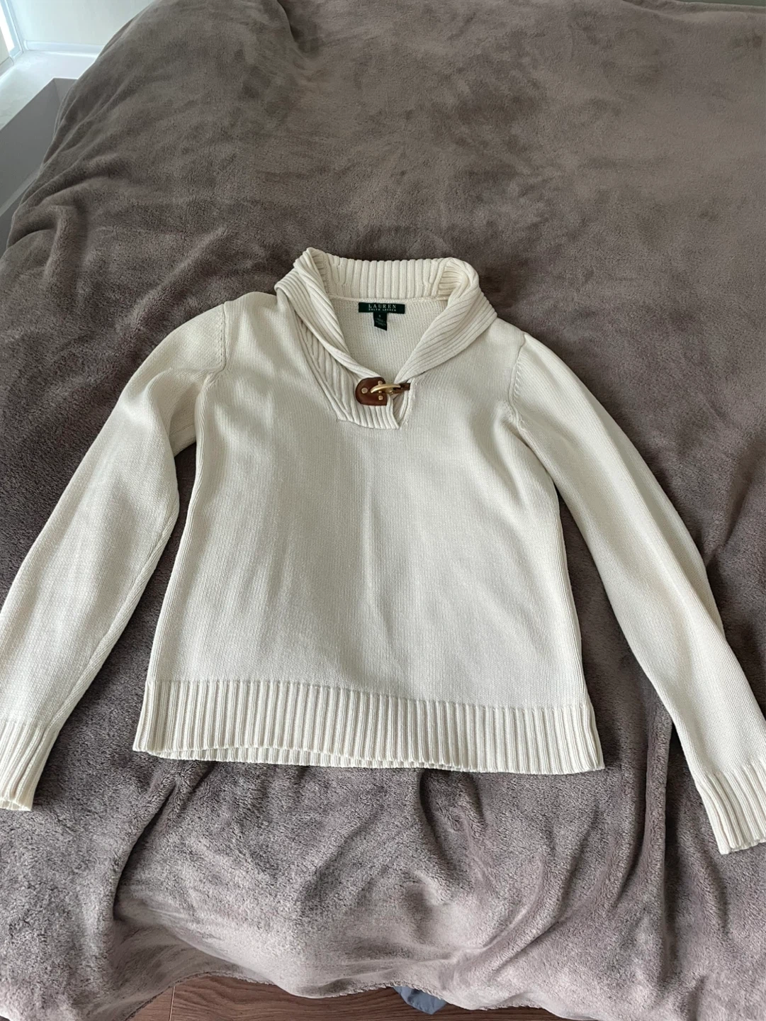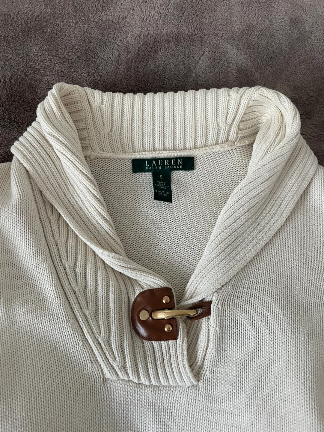 This is a cream-coloured Lauren Ralph Lauren sweater. It's a size small and made from a knit material. It has a shawl collar with a decorative leather and gold buckle closure