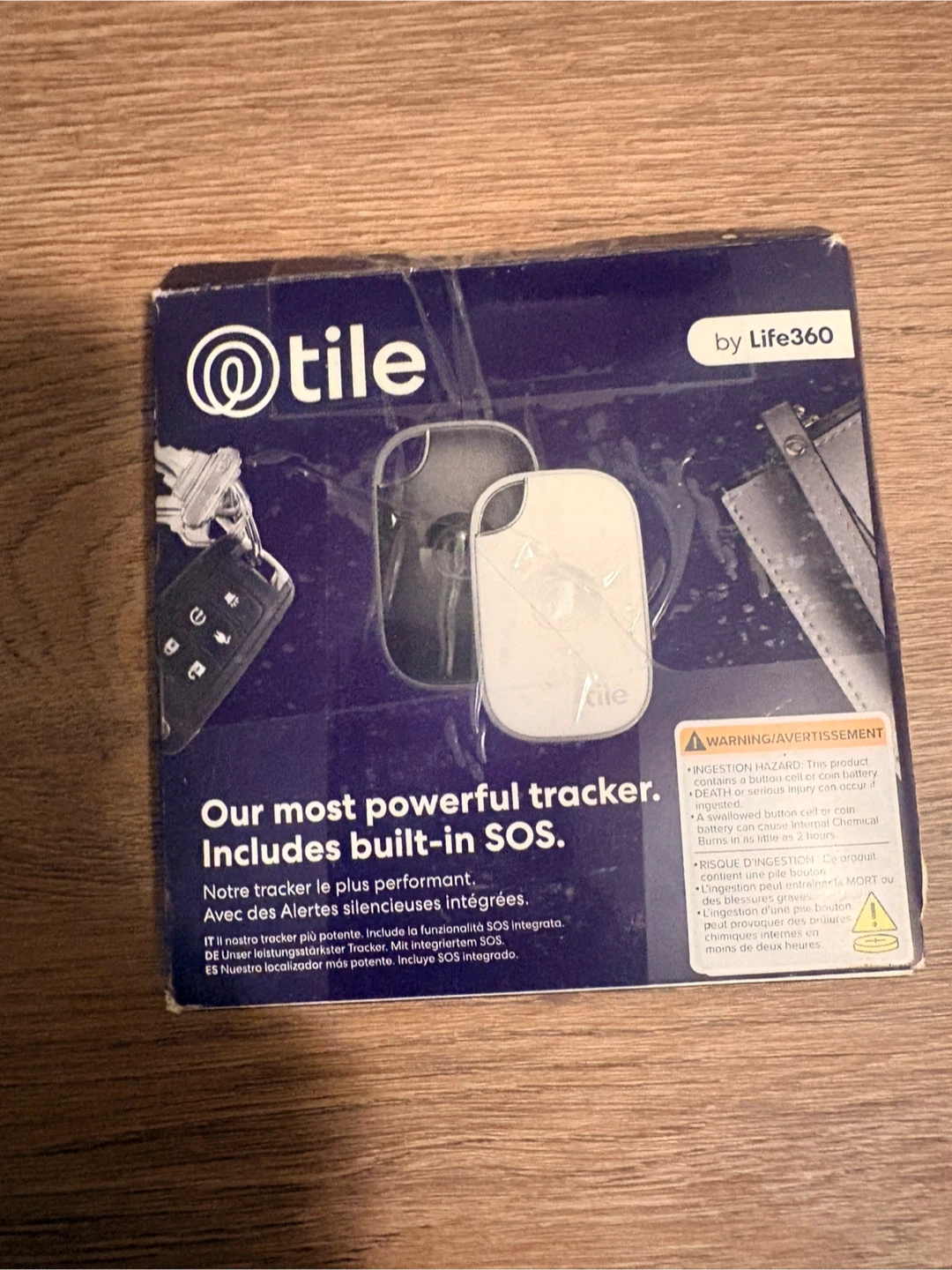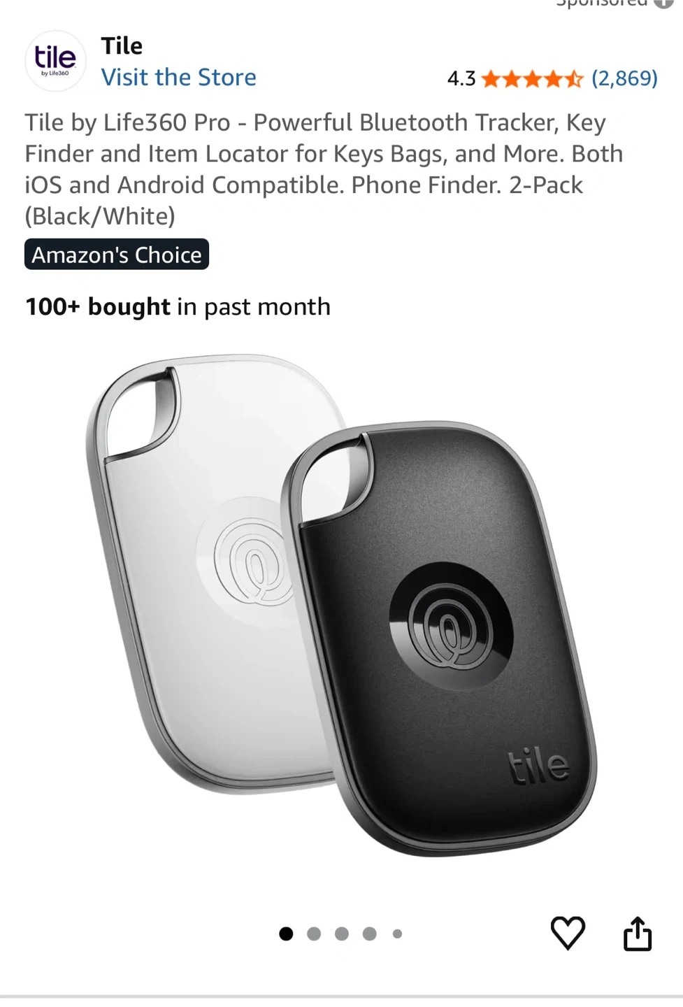 This is a 2-pack of Tile by Life360 Pro Bluetooth trackers, one in black and one in white. These powerful trackers include built-in SOS functionality. They're designed to help you find keys, bags, and more.