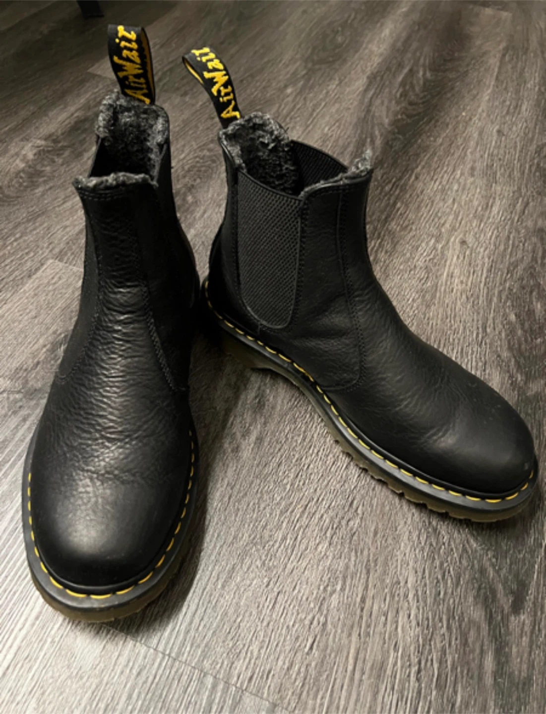 Men’s Dr. Martens 2976 Chelsea boots! They're lined with faux fur to keep your feet warm and comfy. These are a US size 10.