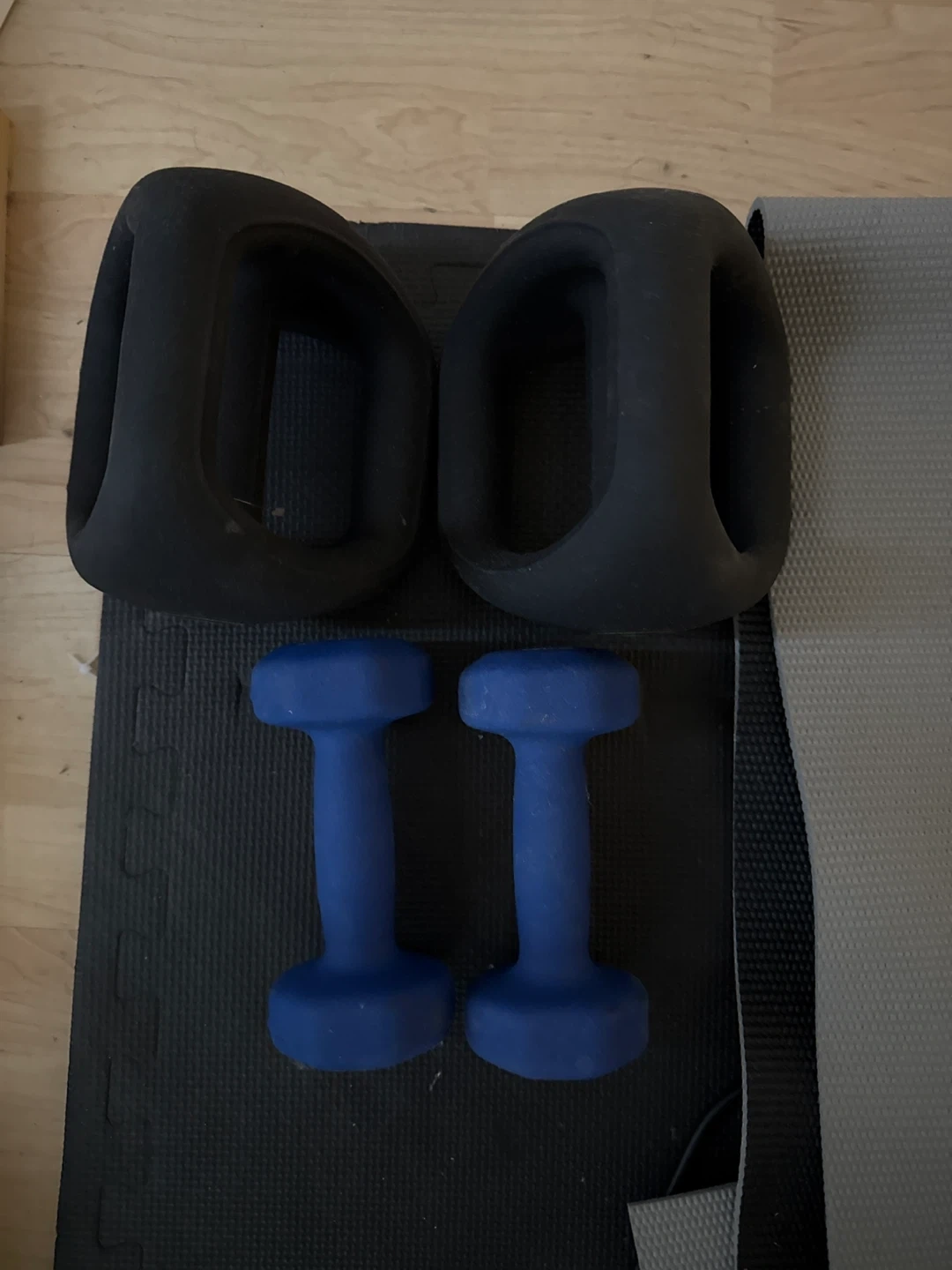 Selling a set of dumbbells including black kettlebell weights and blue hand weights. They're in good condition and ready for your next workout!