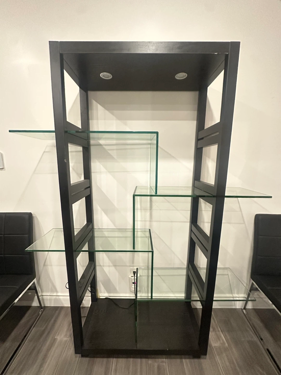 A modern display shelf with black wood frame and clear glass shelves. It includes two small LED lights at the top. This shelf offers a unique tiered design for showcasing items✨